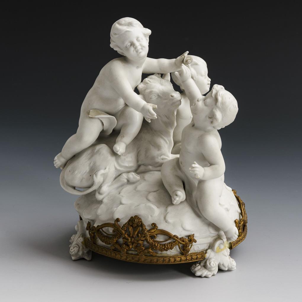 Drei Putten mit Stier auf einem Natursockel. Sockelrand mit einer Bronzemontierung gefasst. Montierung jünger aufgeklebt, Tuch eines Putto, 2 Finger und 1 Blüte bestoßen.