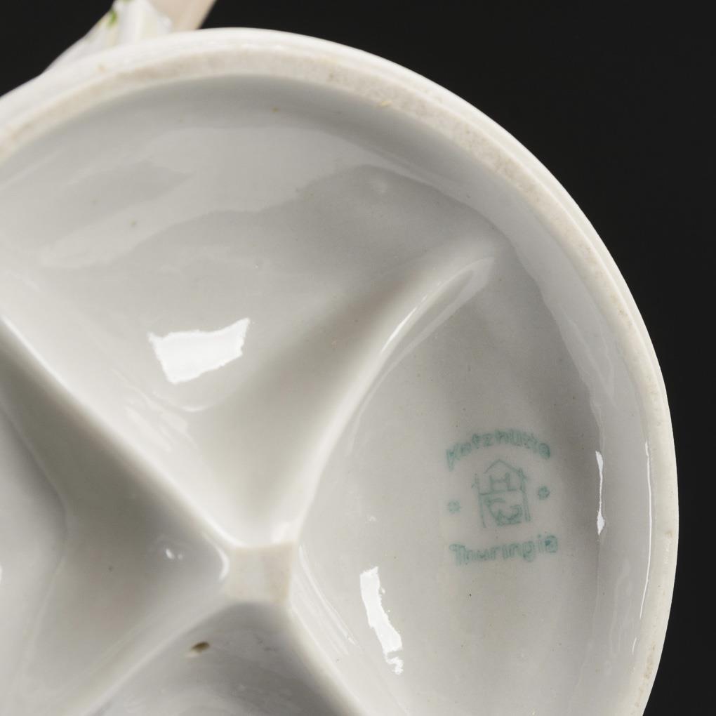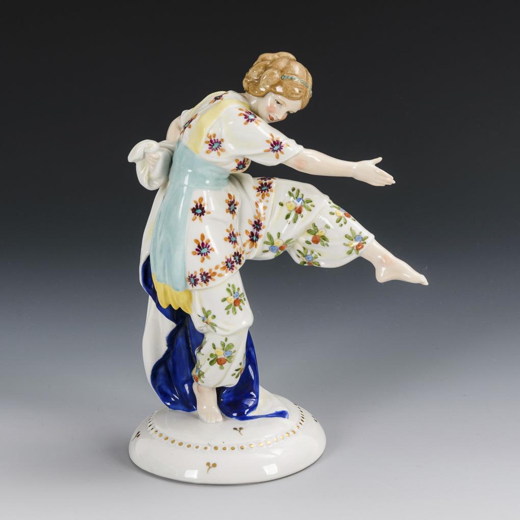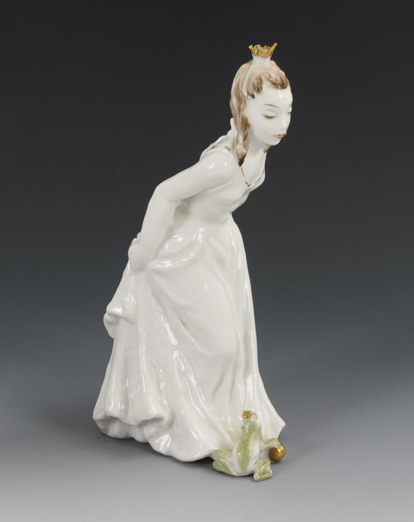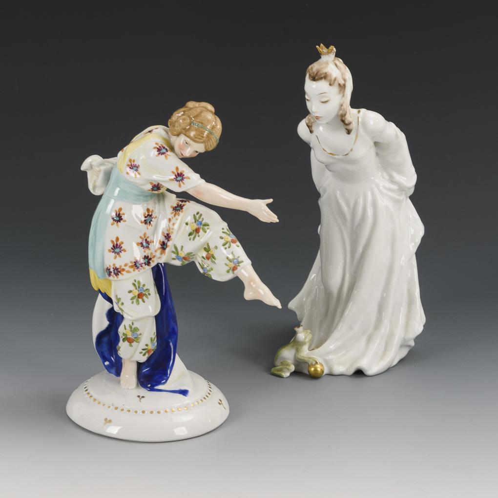 1x Katzhütte, um 1930: junge Frau in Tanzpose (H 19 cm). / 1x "Froschkönigin", Rosenthal, 2. H. 20. Jh., Entwurf von Lore Friedrich Gronau, 1948: Prinzessin mit Krone, zu ihren Füßen ein Frosch mit goldener Krone und Kugel sitzend (H 20,5 cm). 2 Zacken der Krone fehlen, Bestoßung am linken Fuß der Tänzerin.