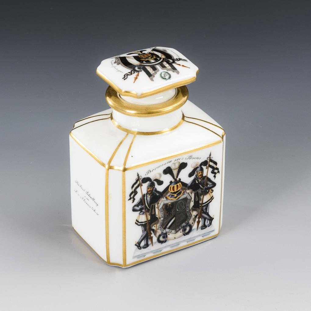 Rechteckige Dose mit Stopfen. Beidseitig eine Wappendarstellung, 1x das Wappen des Corps Borussia Bonn und 1x ein Wappenschild mit Tor und der Bezeichnung "FEST" auf einer Banderole. Auf den Seiten die Widmung Robert Schalburg s/m F. v. Alvensleben, Bonn 1853".