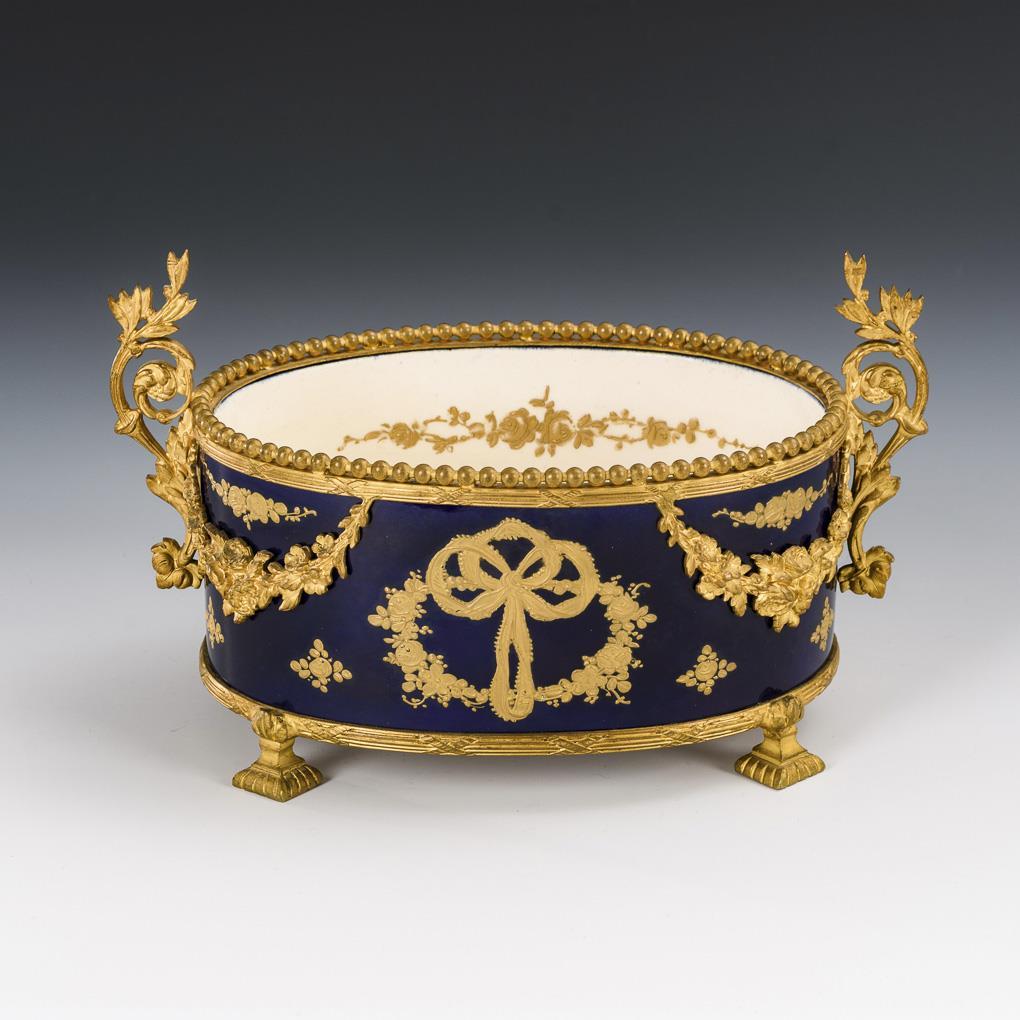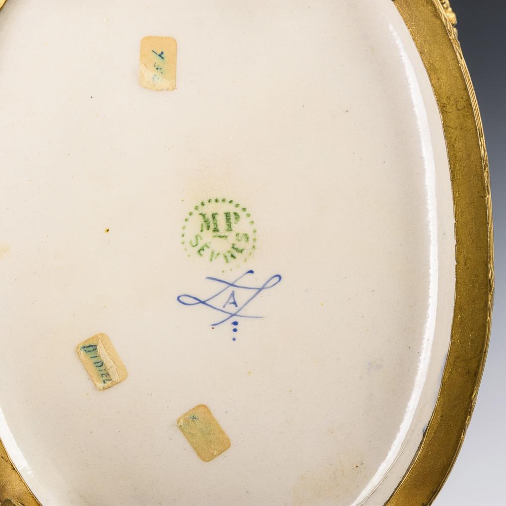 Historisierendes, ovales Gefäß mit goldbronzierter Metallfassung im Louis-Seize-Stil. Schauseitig ein barockes Liebespaar, rechts unten bezeichnet "Didier". Partiell leichte Dekordefekte.
