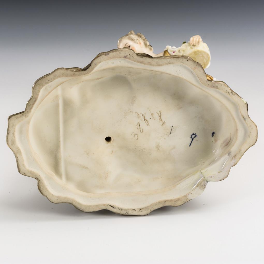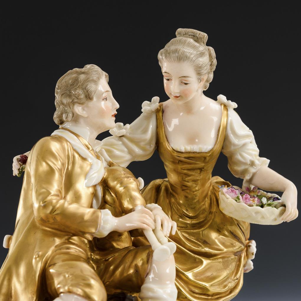 Paar auf einem Felssockel in goldener Kleidung. Blüte in der rechten Hand der Dame restauriert.