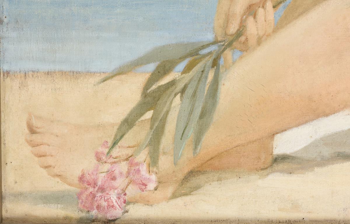 Junge Frau auf einem weißen Laken am Strand bei hellem Licht mit einem blühenden Lorbeerzweig und Blick aufs Meer. Kleiner Defekt am Rand.