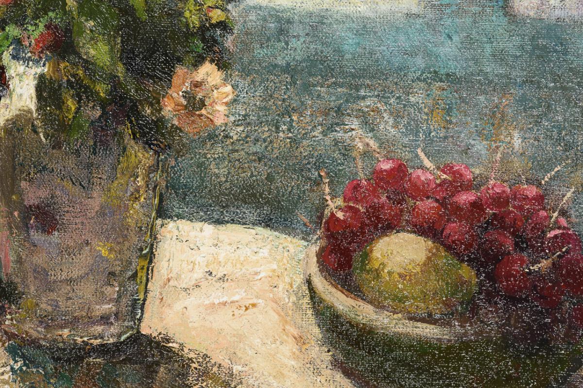 Kirschen in einer Schale neben einem Strauß Rosen auf einem Tisch im hellen Licht.