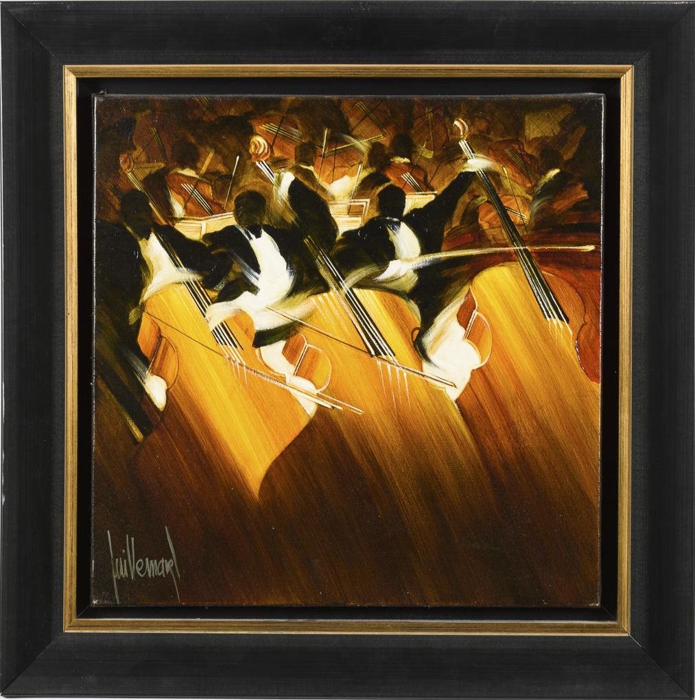 Abstrakt dargestellte Musiker eines Orchesters im heftigen Spiel.
