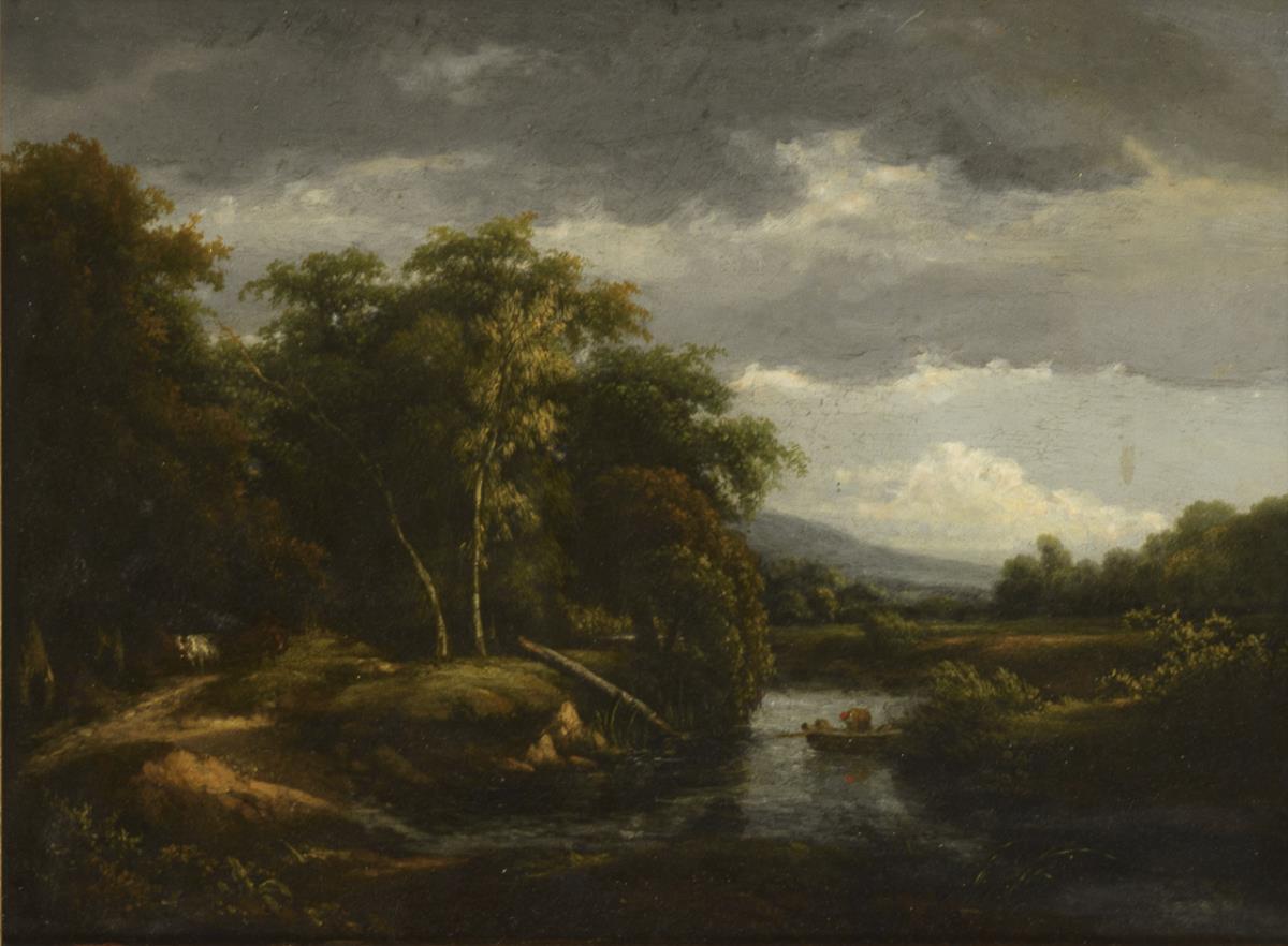 Vieh am Waldrand nahe dem Flussufer mit dem Kahnfahrer. Leichte Altersspuren.