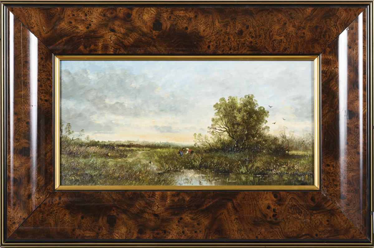 Weite Landschaft mit Staffagefiguren unter leicht wolkigem Himmel.