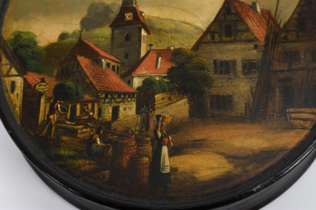 Runde Dose; auf dem Deckel idyllisches Dorf mit Staffage. Krakeliert, Wandung überlackiert, wenige Alters-/Gebrauchsspuren.