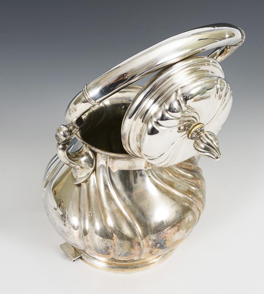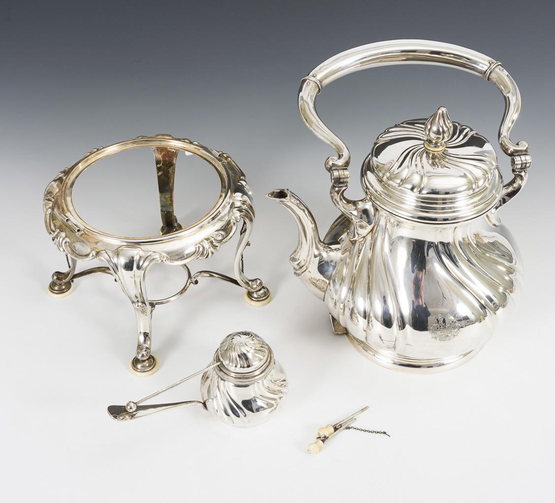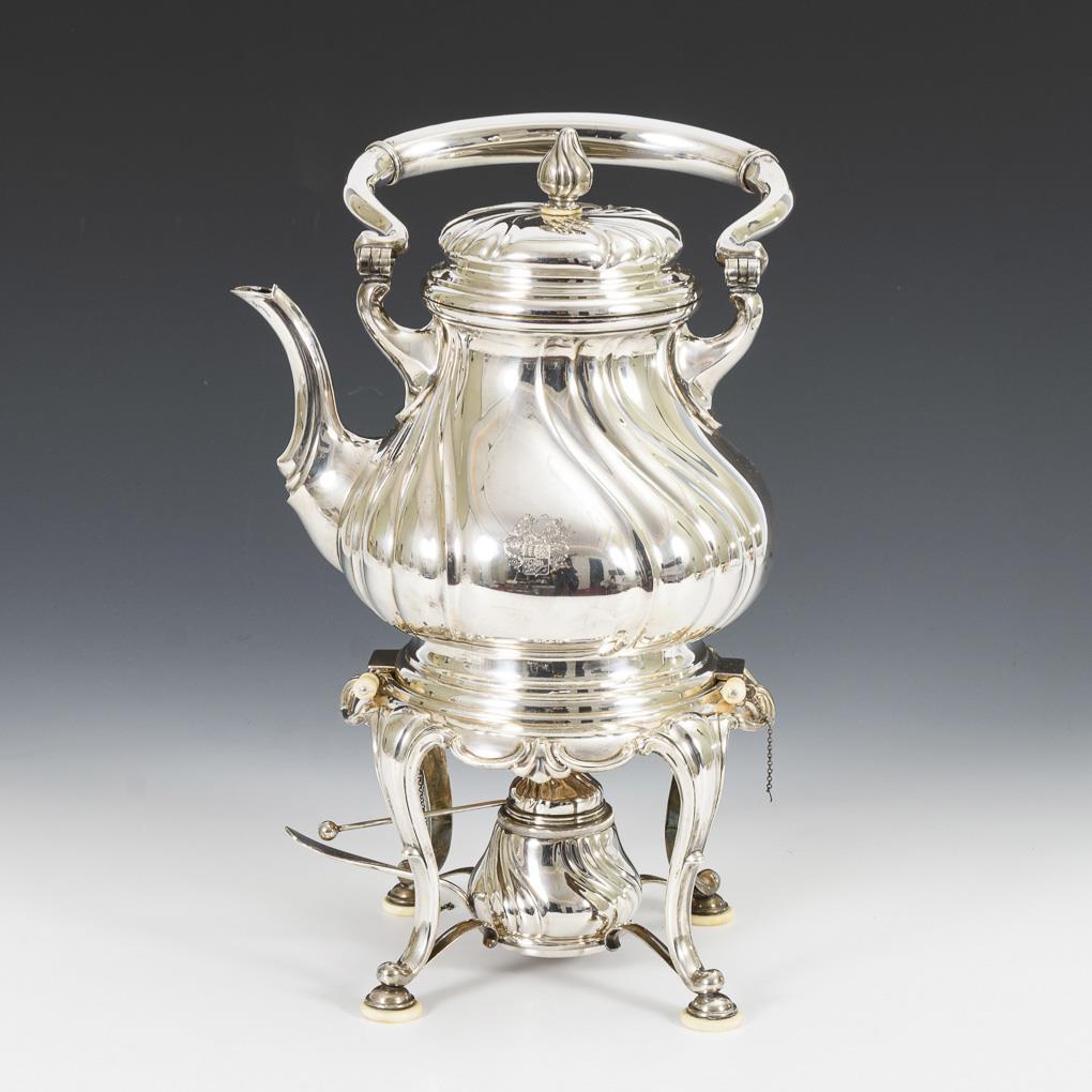 Godronierte Teekanne mit Scharnierdeckel. Auf geschweiftem Stövchen mit Brenner. Schauseitige Wappengravur (wohl Familie Straka von Hohenwald). Einige kleine Dellen, Deckelknauf locker.