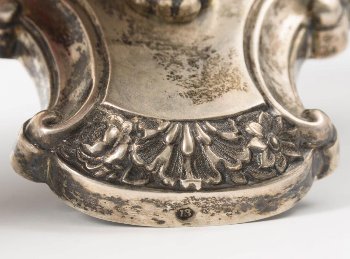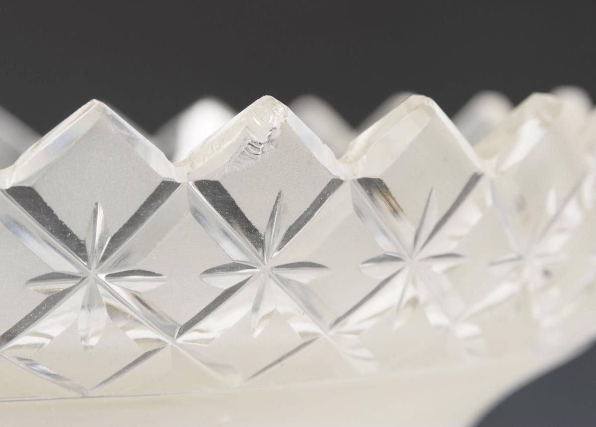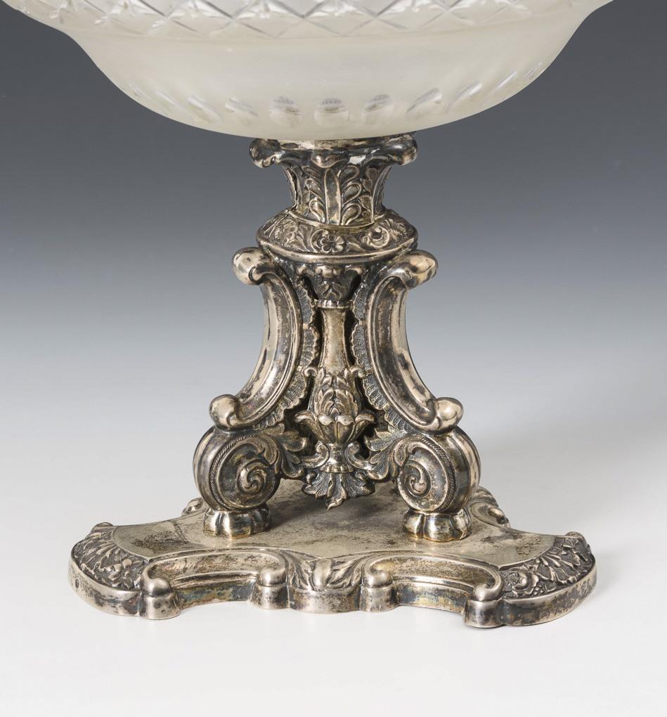 Dekorativ beschliffene Schale auf reliefiertem Silberfuß. Wenige Chips am Glasrand, Silber am Fußansatz mit kleiner Bruchstelle.