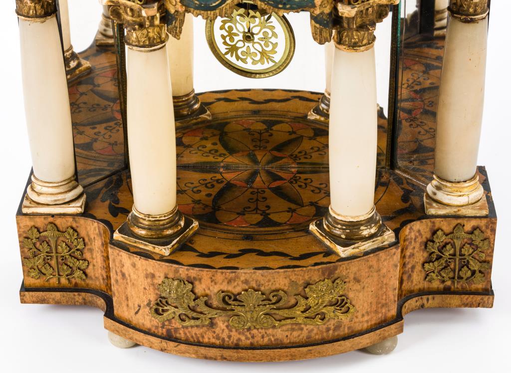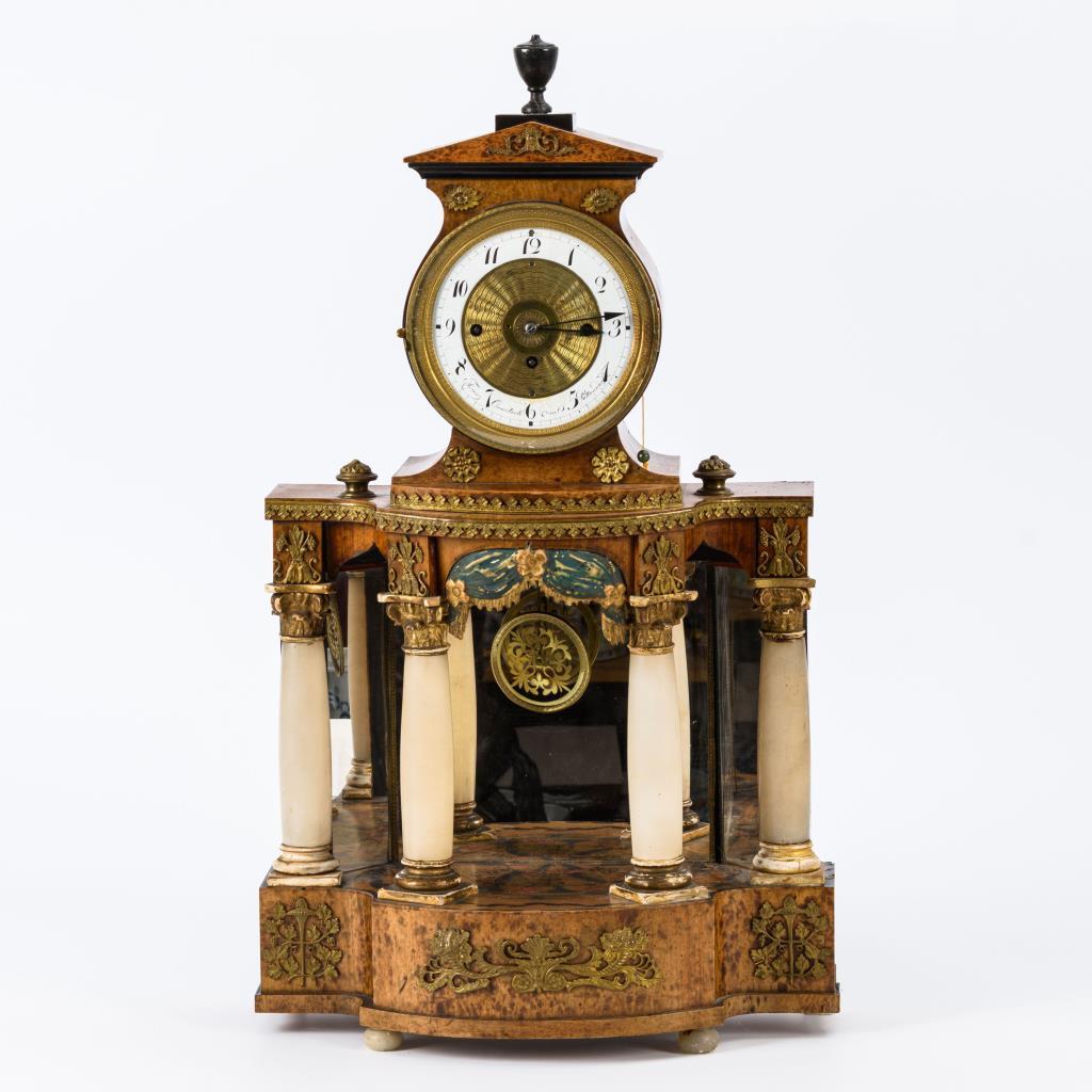 Verschiedene Hölzer, Messing, Alabaster, teils farbig staffiert. 4-säulige Portaluhr mit verspiegelter Rückwand und bekrönender Uhrentrommel mit Giebeldach und Vase. Werk läuft.Altersspuren, Defekte, Ergänzungen.