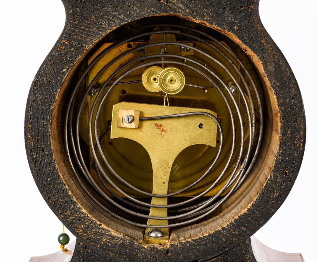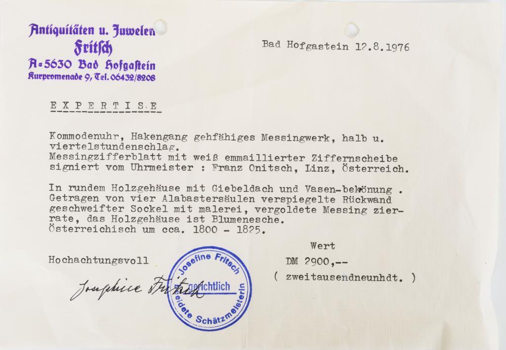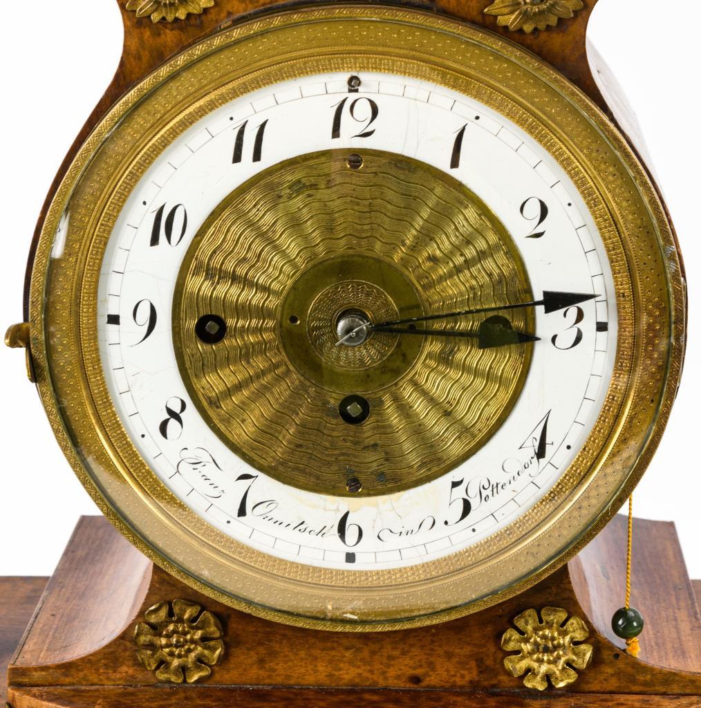 Ungemarktes Messingwerk mit Viertelstundenschlag auf 2 Tonfedern, Repetitionszug.Weißes Emailzifferblatt mit arabischen Zahlen, Minuterie und Pfeilzeigern.Herstellerprägung Anzeige: Bezeichnet "Franz Onnitsch in Pottendorf".