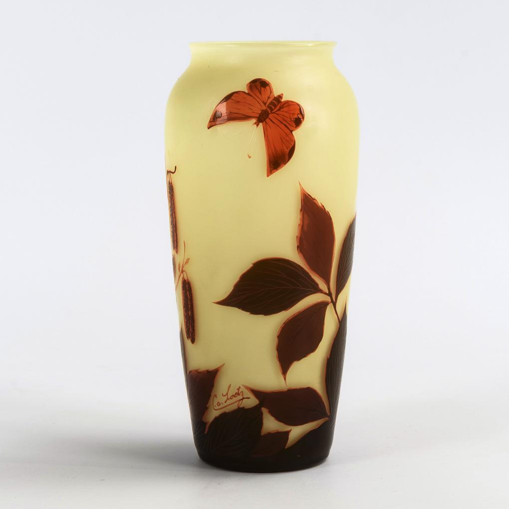 Balustervase mit umlaufend geätztem Blattdekor mit einem blühenden Birkenzweig und einem Schmetterling.