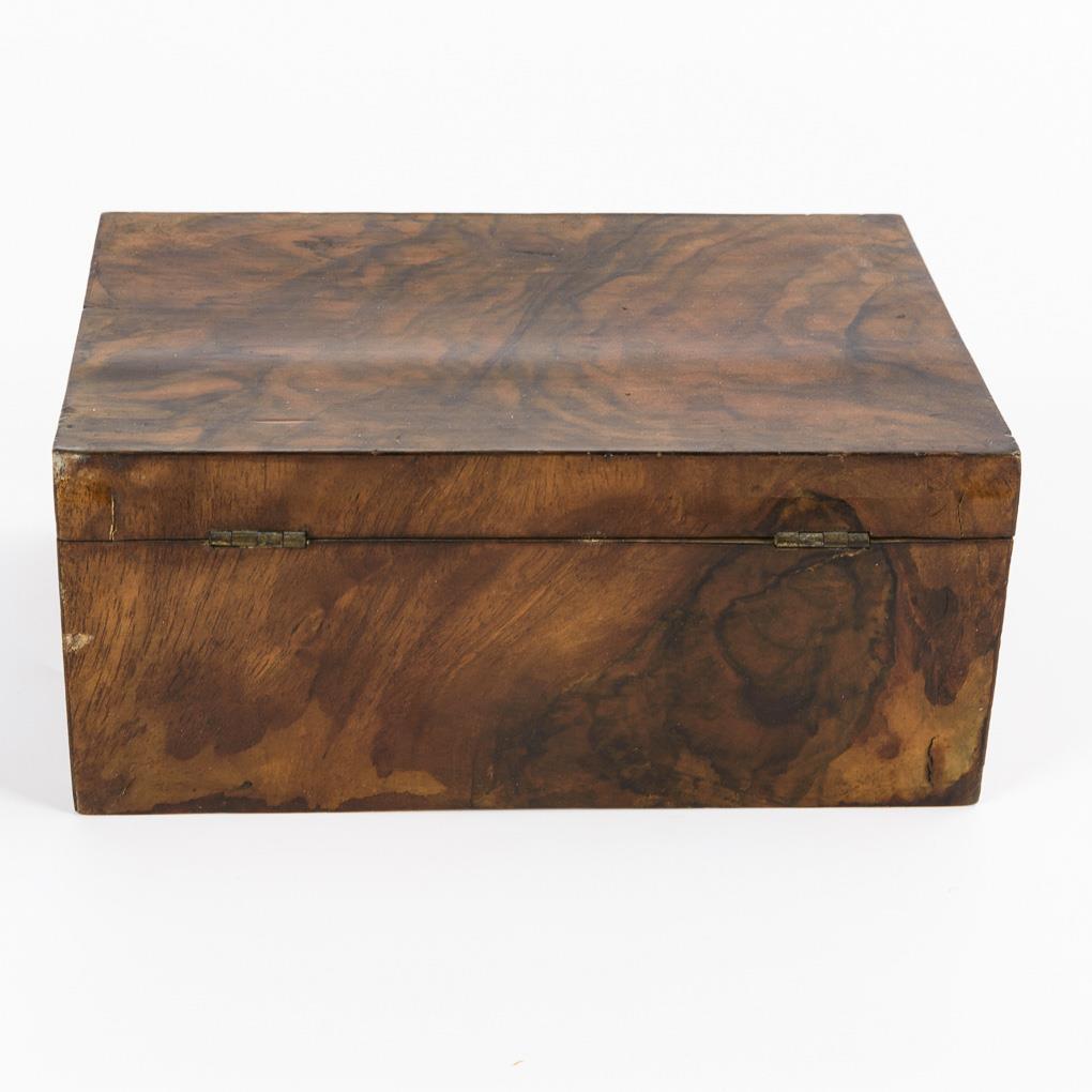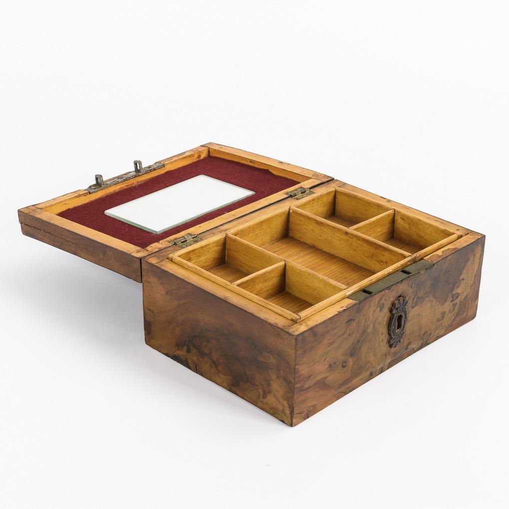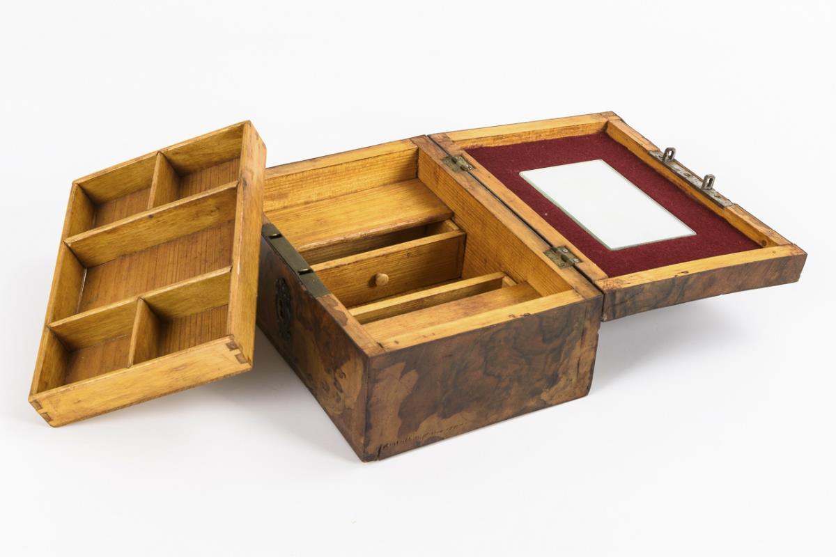 Rechteckiger Korpus, im Innendeckel jüngerer Spiegel. Innen zwei fest eingebaute Schübe und fünffach gegliederter Einsatz. Einige Furnierschäden und leichte Trockenrisse.