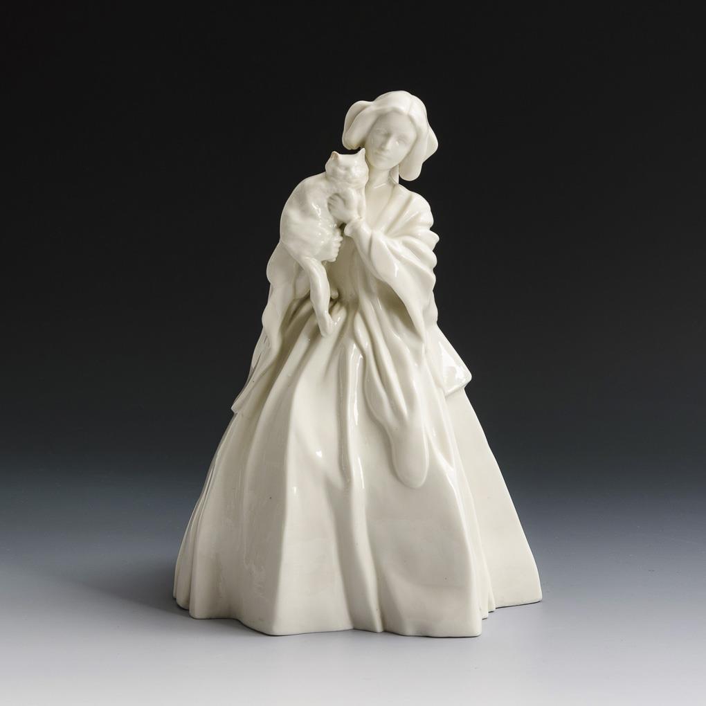 Stehende, eine Katze auf dem Arm tragende junge Frau. 1 Katzenohr restauriert und bestoßen.