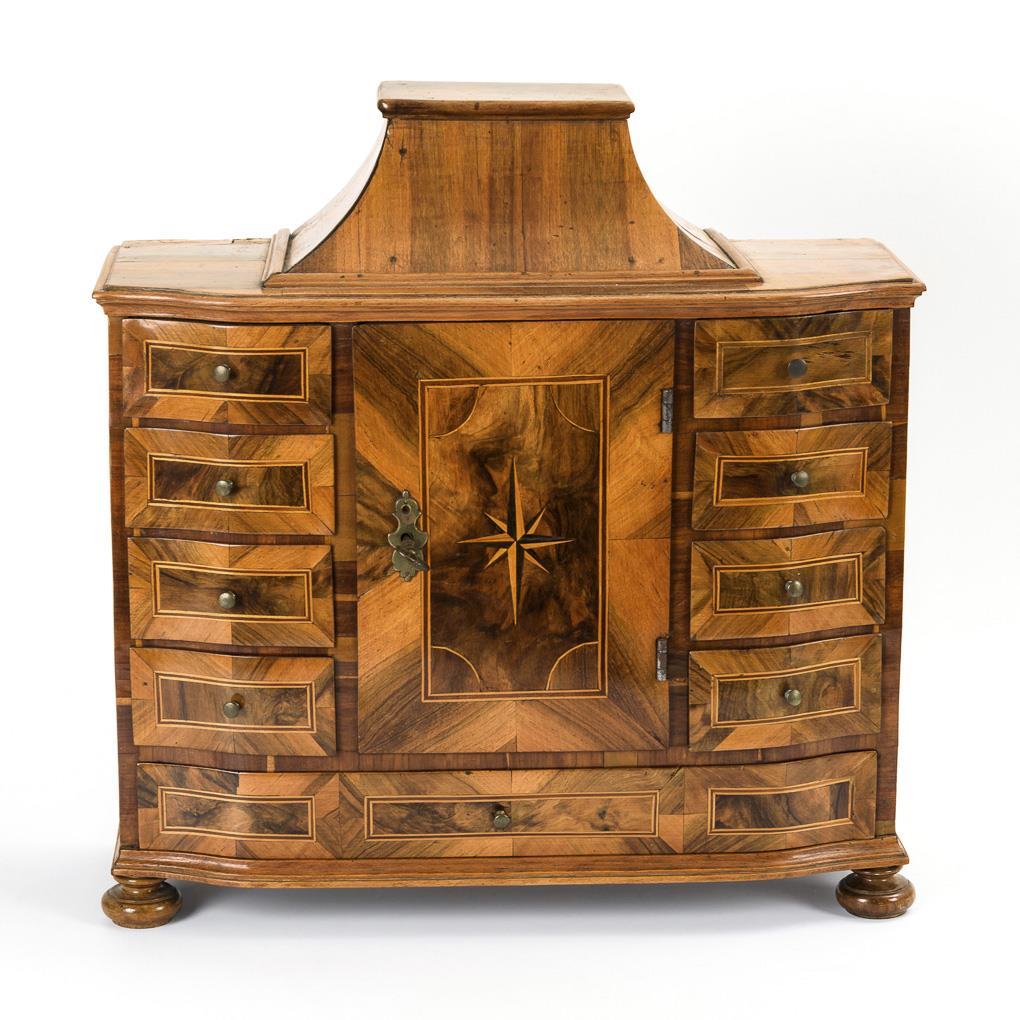 Kabinettschränkchen mit Zentraltür und 9 Schüben in der leicht geschwungenen Front; walmdachförmige Bekrönung. Im Zentralfach 3 kleine Schübe mit bemalten Papiereinlagen in den Scheinkassetten sowie Verriegelung der seitlichen Schübe. Einige Alters-/Gebrauchsspuren, 1 Schubverriegelung fehlt, einige Ergänzungen.