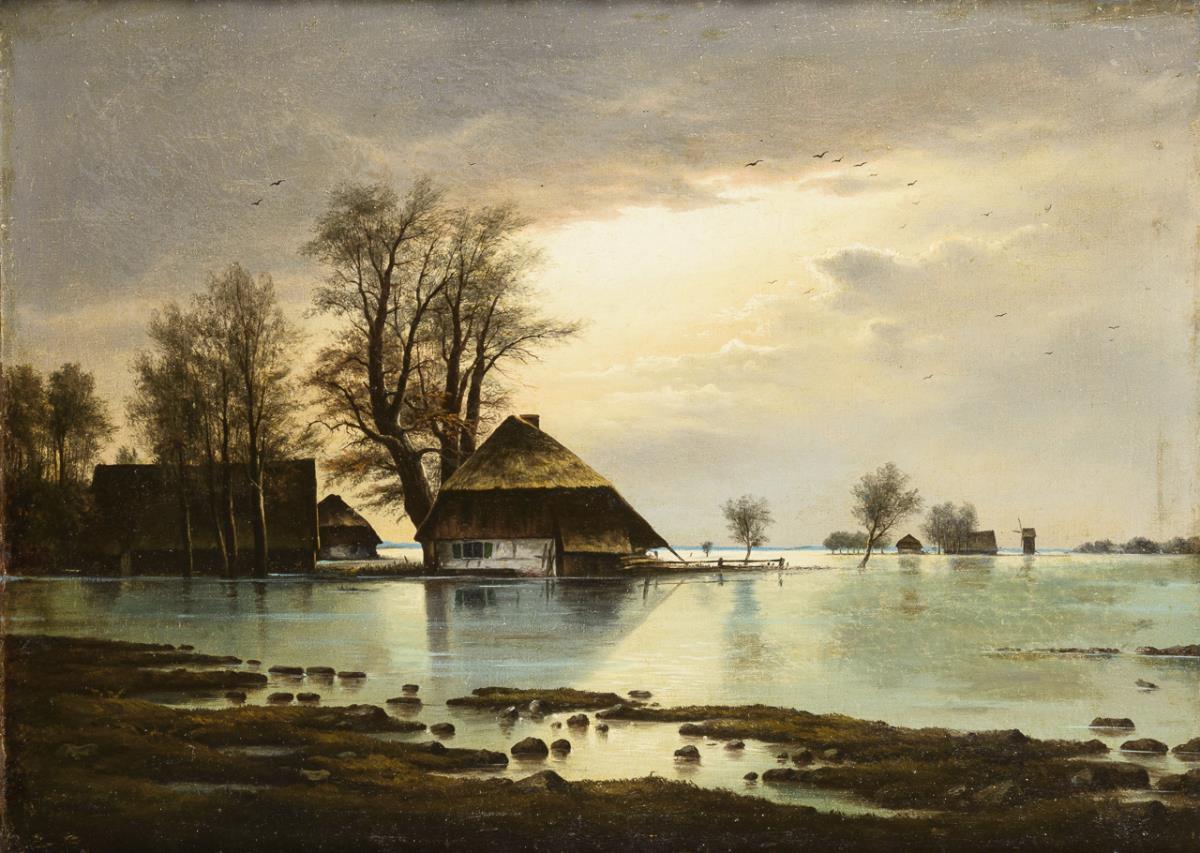 Die bekannte Hochwasserszene mit den Gehöften in weiter, flacher Landschaft. Zwei kleine restaurierte Stellen mit Hinterklebungen.