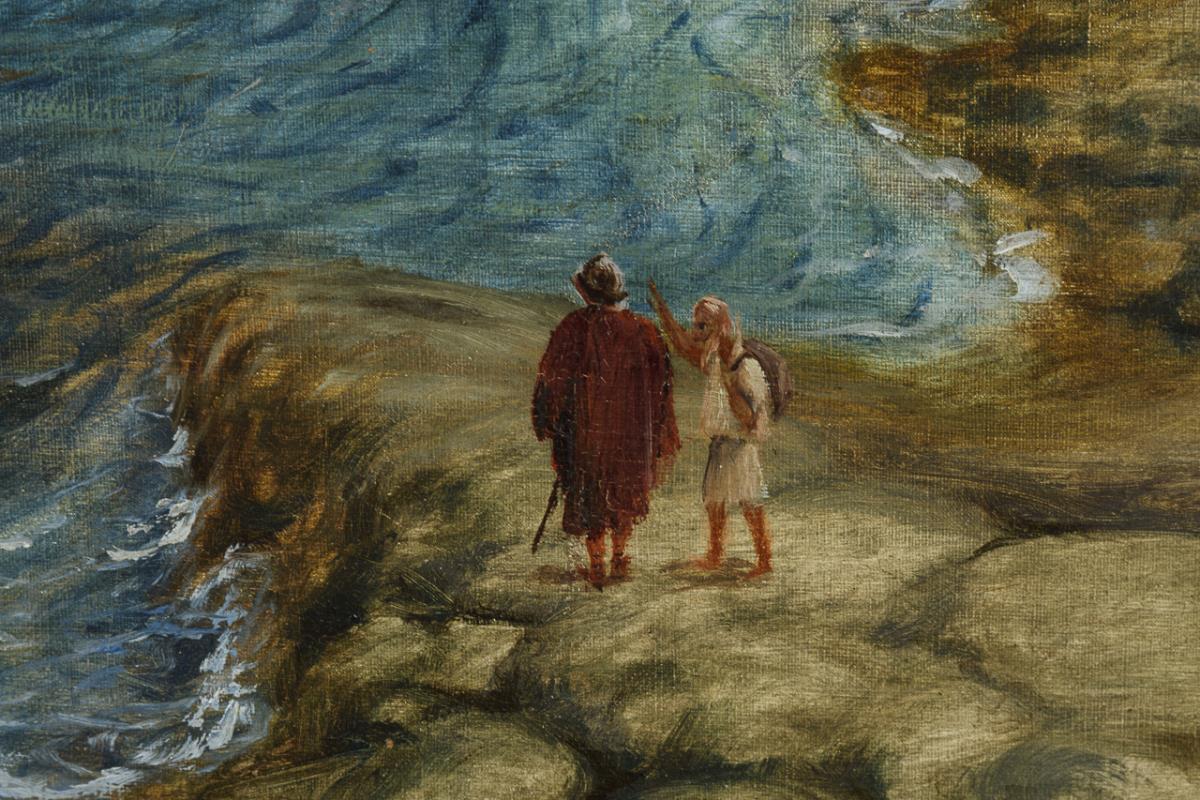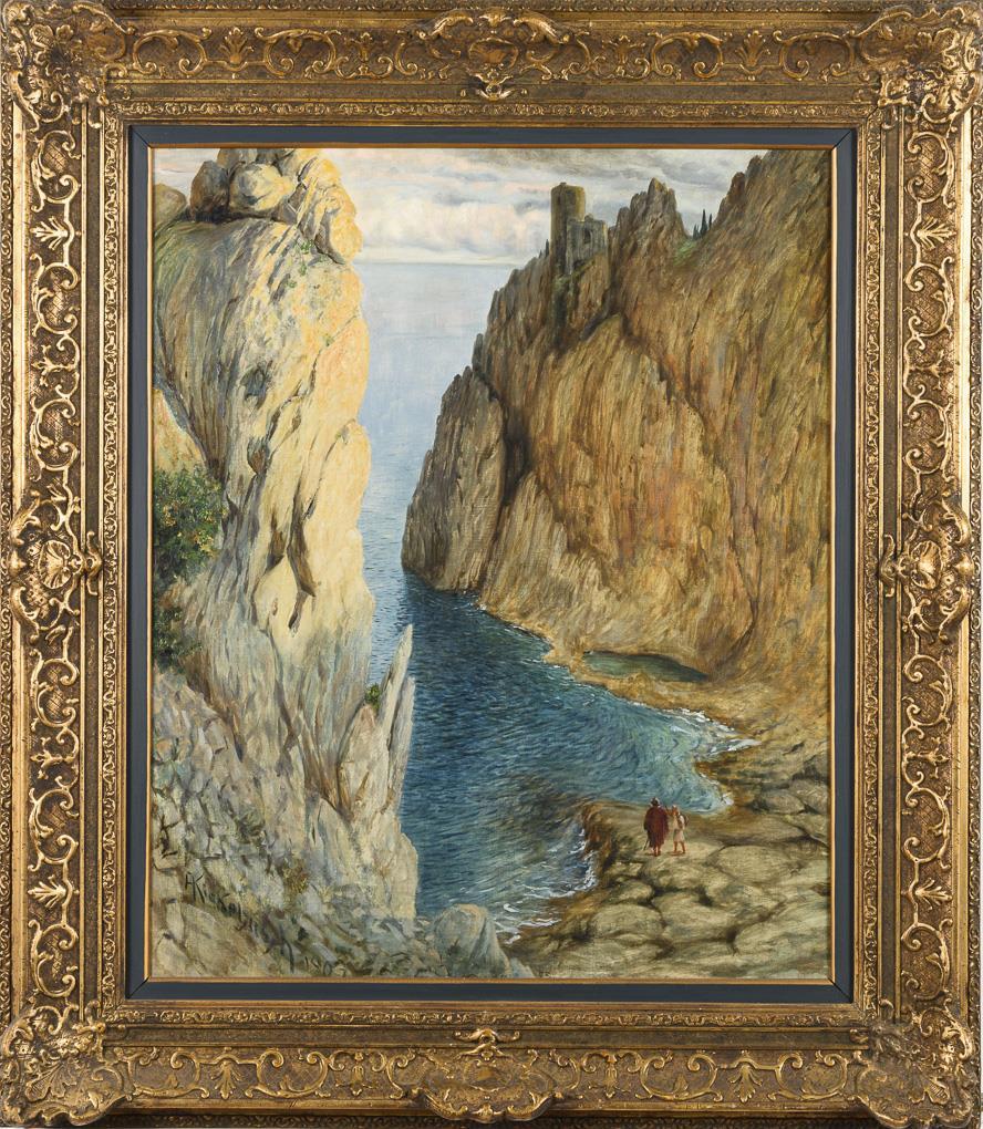 Staffagefiguren am felsigen Ufer zwischen hohen Klippen mit Blick aufs Meer.