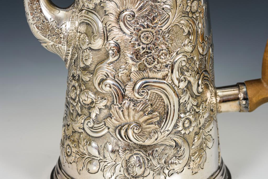 Reich reliefierte, konische Kanne mit geschweiftem Holzhenkel. Lötstellen, Boden wohl ergänzt.