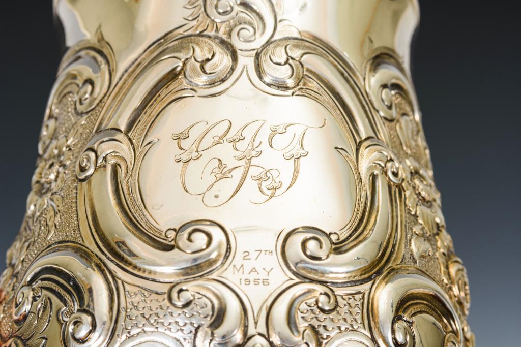 Floral reliefiert mit späterer Widmungsgravur: "CJF 27th May 1955". Minimale Bearbeitungsspuren am Boden.