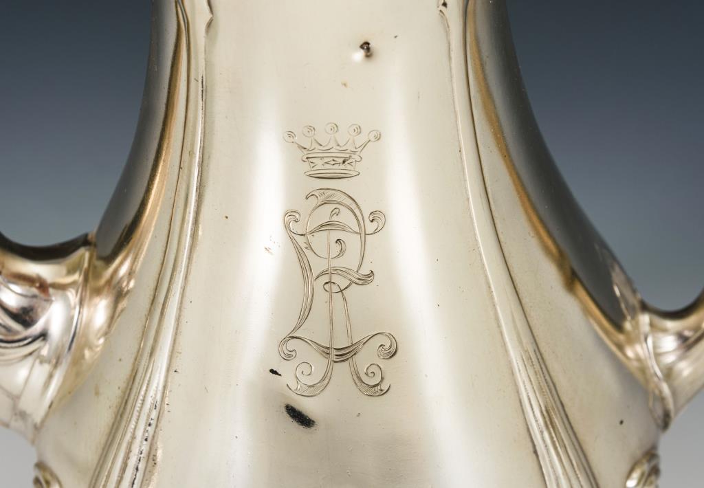 Floral reliefiert mit Fruchtmotiven, geschwungenen Bändern und bekrönter Monogrammgravur "ER". Zuckerdose innen vergoldet. Gebrauchsspuren, Kaffeekanne mit Dellen.