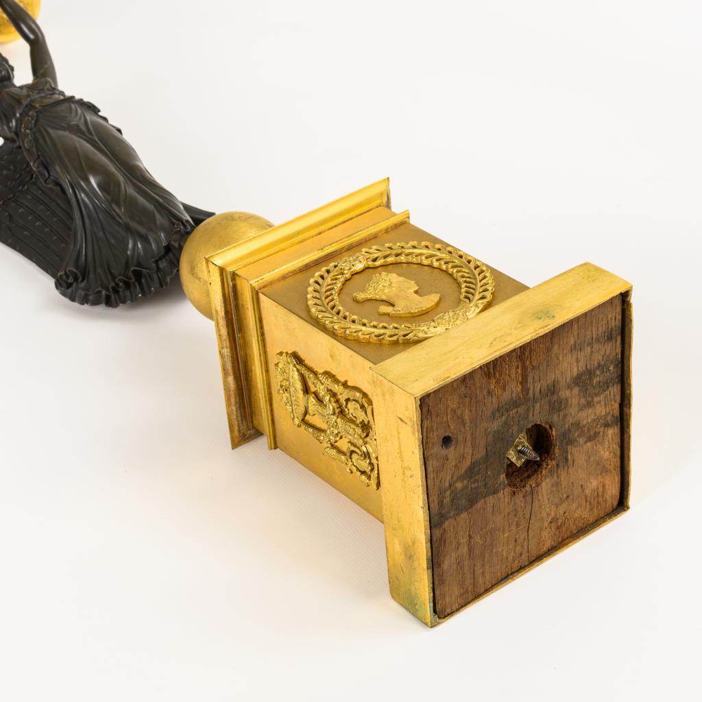 Hohes Postament mit Bronze-Appliken; an der Front je applizierte Büste von Diana bzw. Apollon. Auf einer Kugel stehende, vollplastische Figur der Viktoria, die mit erhobenen Armen den reich reliefierten Leuchteraufsatz mit Vase, 5 Volutenarmen und erhöhter Zentraltülle hält . 1 Volutenarm minimal angebrochen, Verschraubungen gelockert, sonst wenige Alters-/ Gebrauchsspuren.