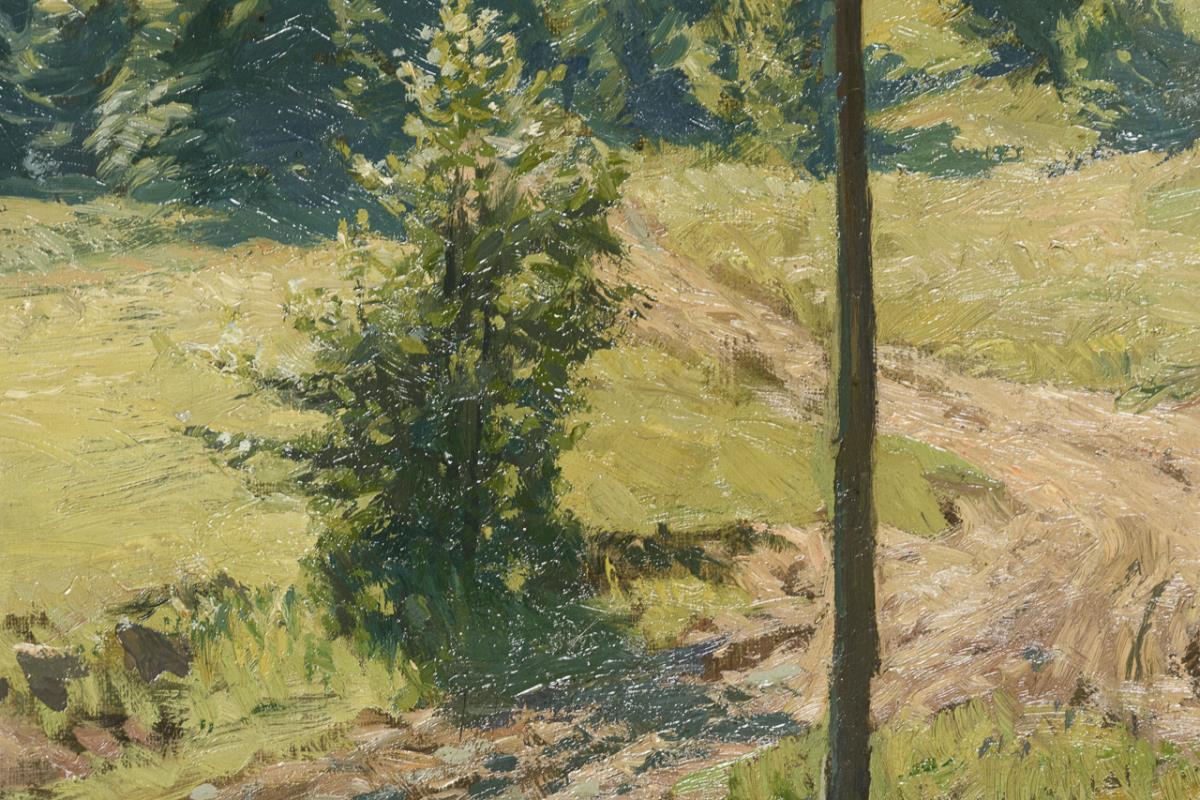 Sonnige Gebirgslandschaft mit dichten Wäldern unter blauem Himmel. Eine kleine restaurierte Stelle.