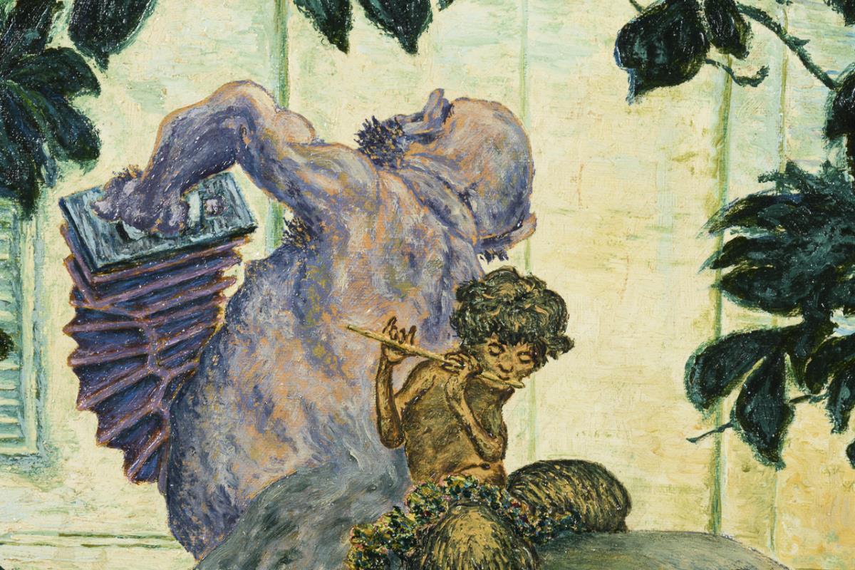 Musizierende Fabelwesen vor dem Fenster einer sich streckenden jungen Frau am Morgen. Eine sehr kleine restaurierte Stelle.