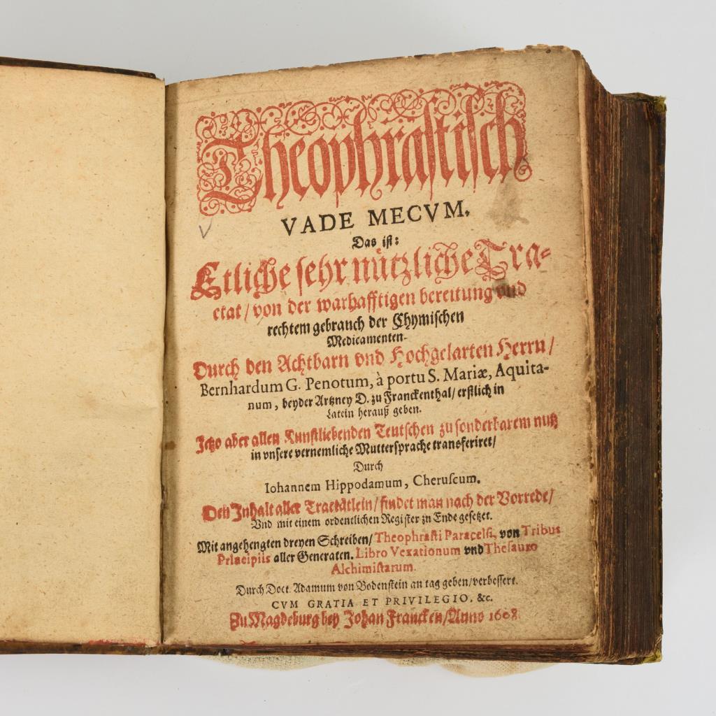 "Das ist: Etliche sehr nützliche Tractat/ von der warhafftigen bereitung und rechtem gebrauch der Chymischen Medicamenten ...Mit angehengten dreyen Schreiben/ Theophrasti Paracelsi, von Tribus Principiis aller Generaten. Libro Vexationum und Thesauro Alchimistarum".Durch Doct. Adamum von Bodenstein an tag geben, verbessert.