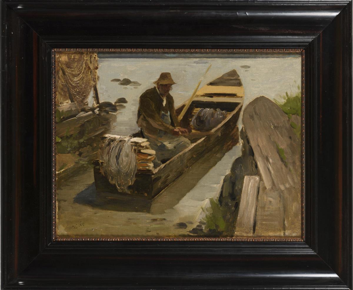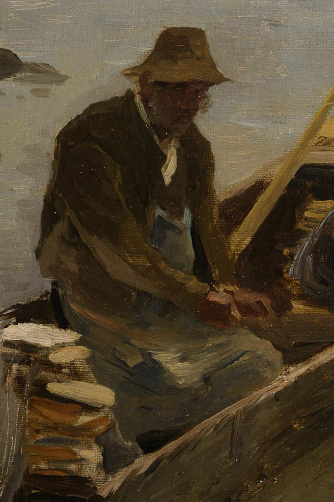 Der Fischer beim Ablegen vom Steg im hellen Sonnenschein.