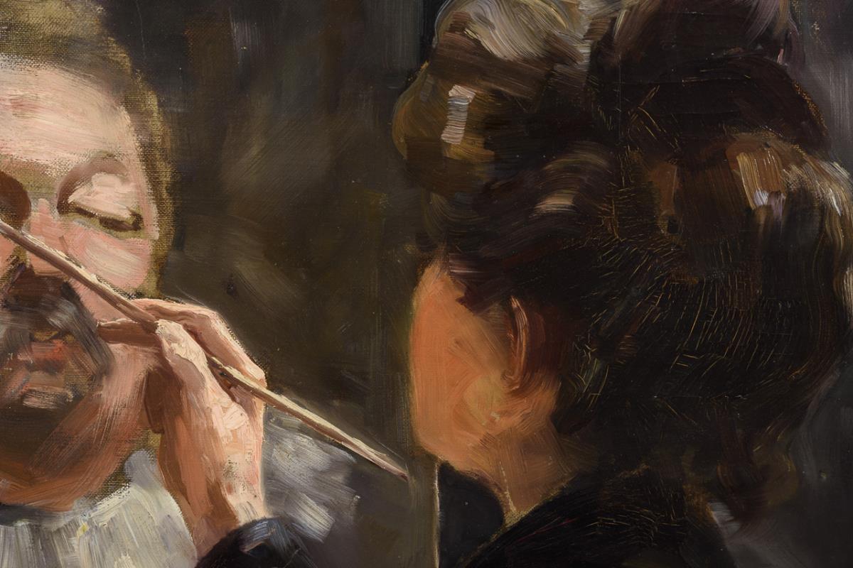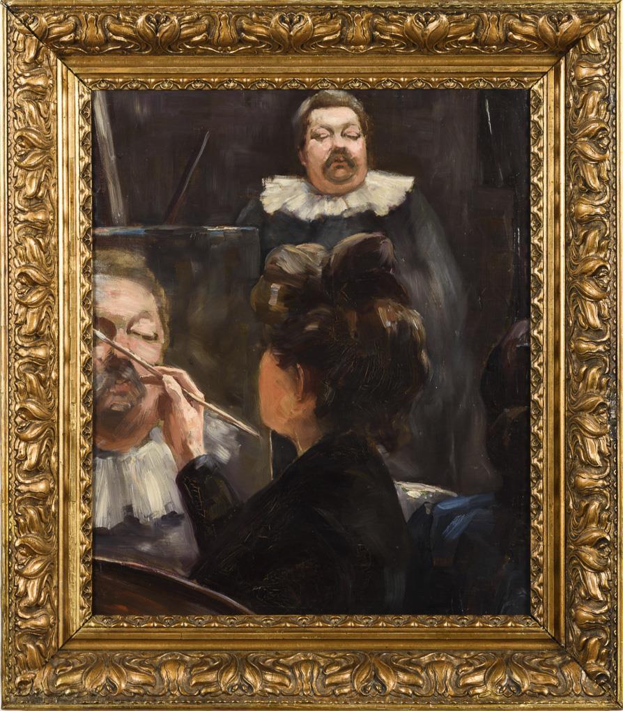 Malende Damen vor einem männlichen Modell mit Shakespearekrause. Minimale Altersspuren.