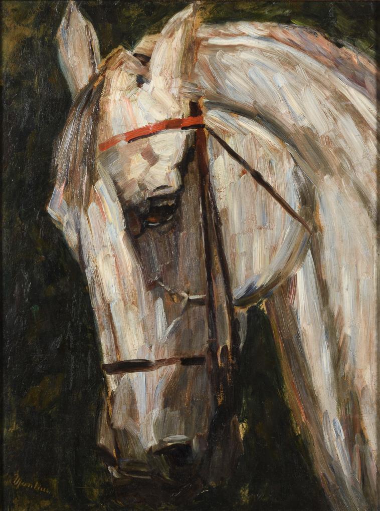 Impressionistisch gemalter Kopf eines weißen Pferdes. Leichte Altersspuren.