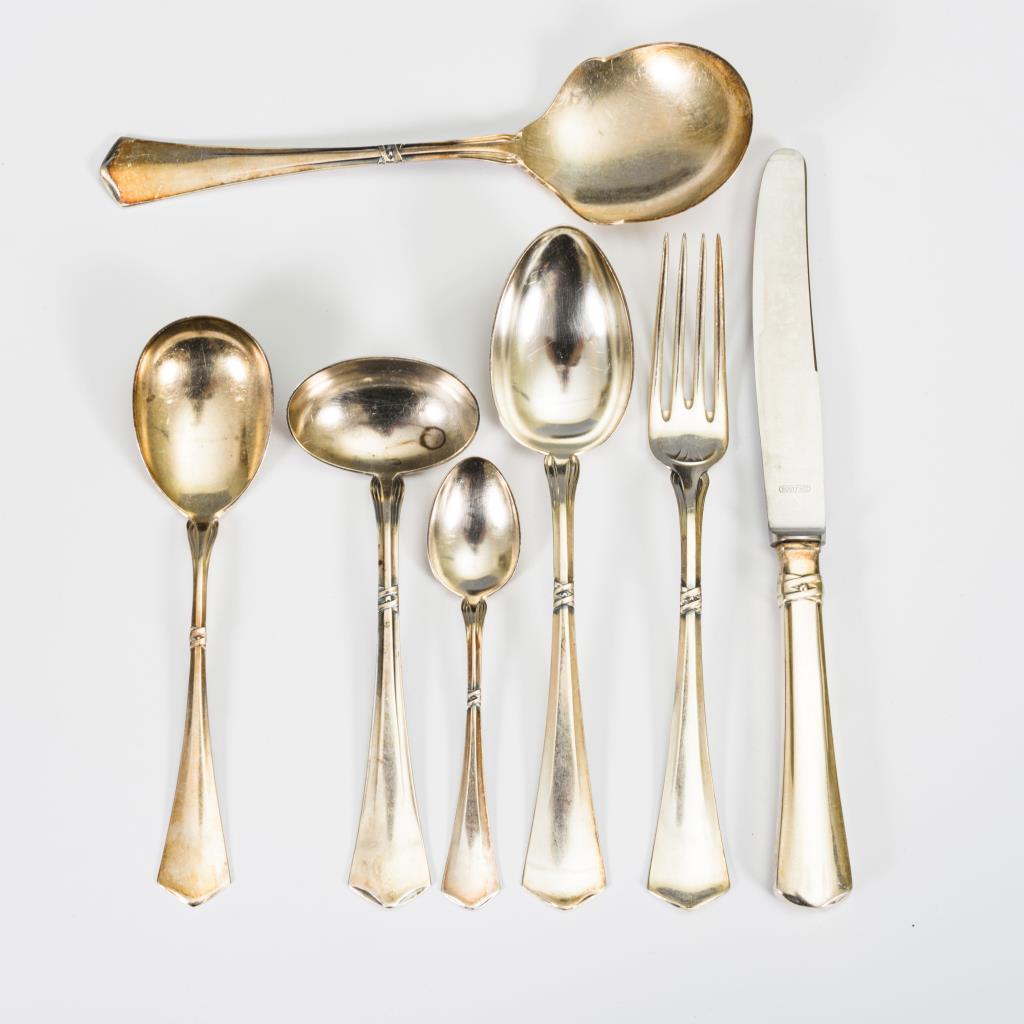 Konische Griffe je mit Düsseldorfer Knoten. Menübesteck für 12 Personen (Messer, Gabel und Löffel), 12 Teelöffel, 2 Vorlegelöffel und 1 kleine Kelle. Geringe Gebrauchsspuren.