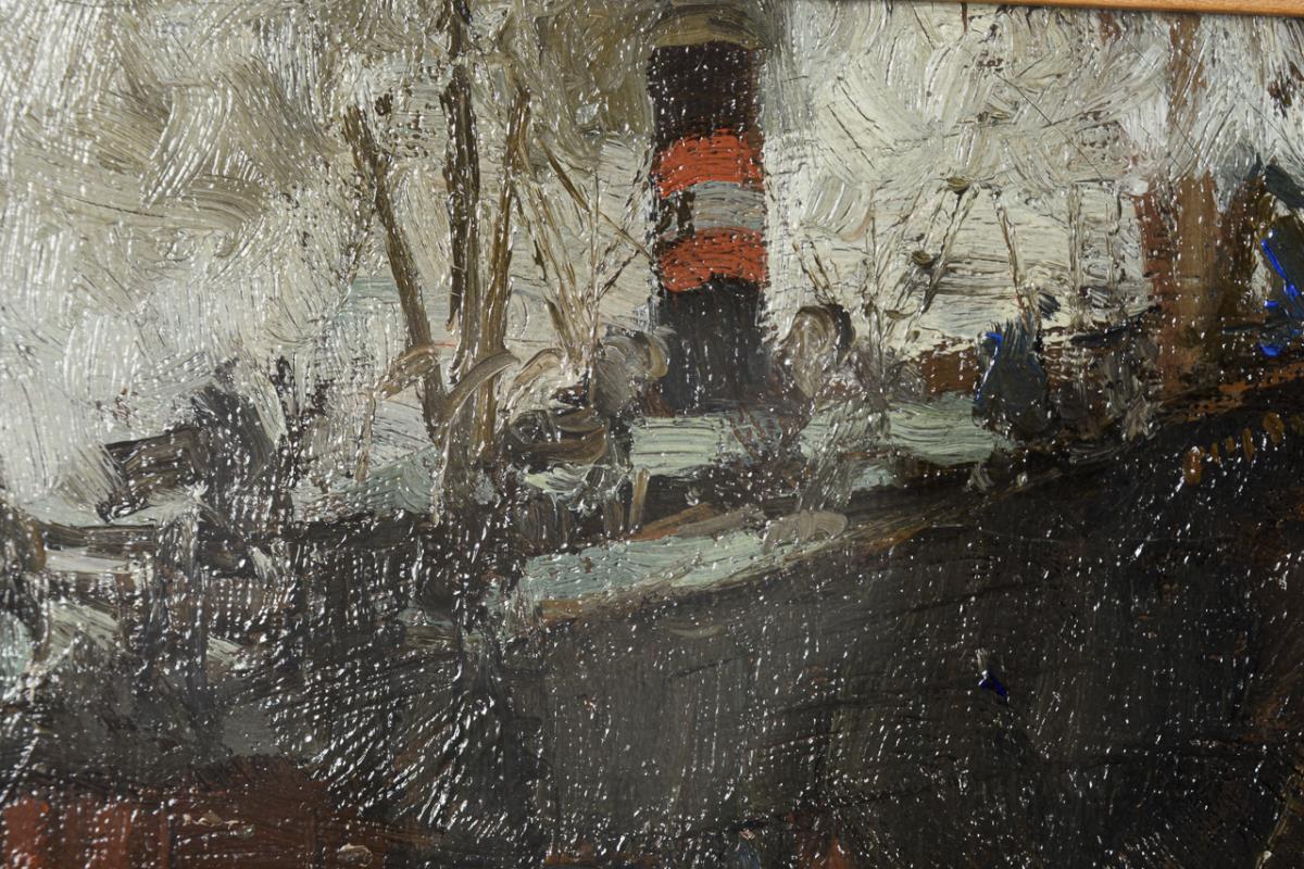 Großes Dampfschiff unter grauem Himmel am Kai.