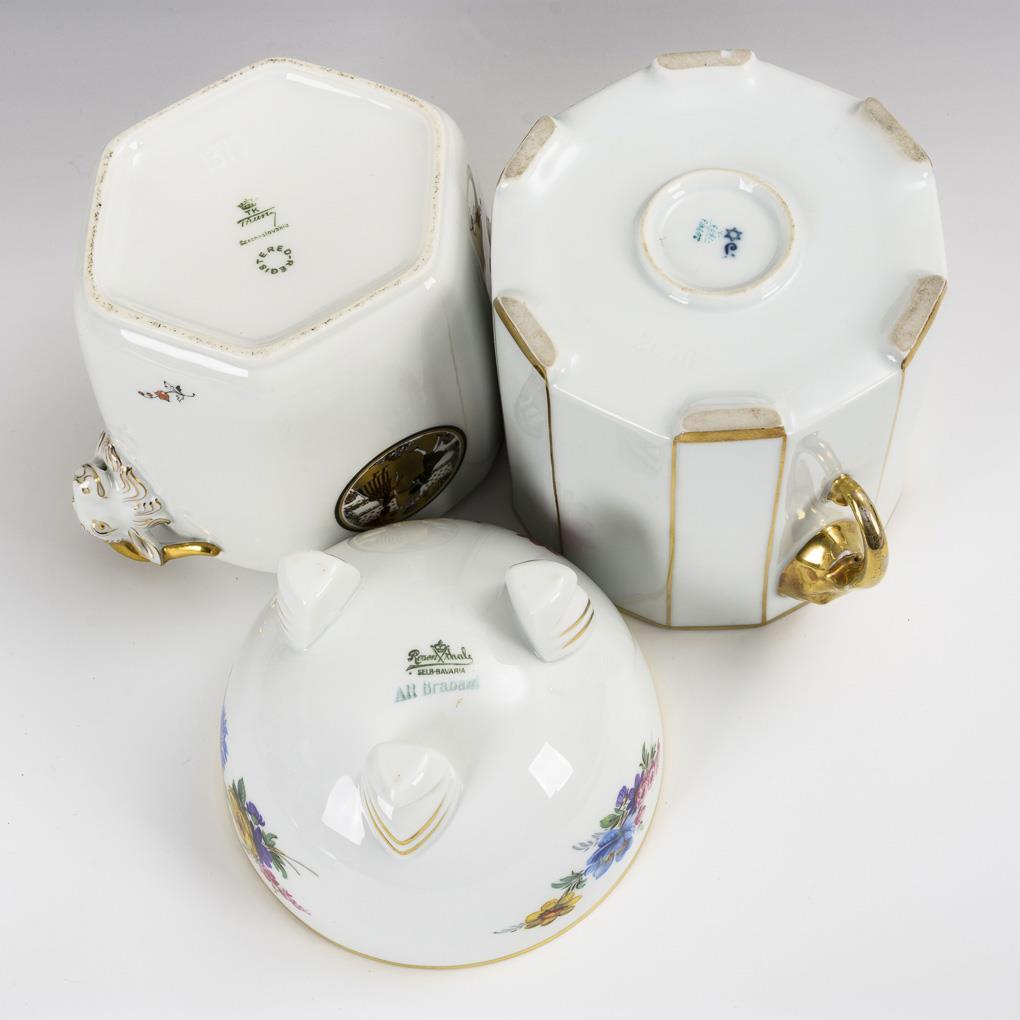 1x Rosenthal: Dose mit drei Füße und farbigem Blumendekor (H 15 cm). / 1x Thun: sechseckige Dose mit Widderkopfhandhaben und Knaufdeckel (H 18 cm). / 1x Lettin: polygonale Dose mit Elefantenhandhaben und Knaufdeckel (H 18 cm). Partiell minimaler Goldabrieb.