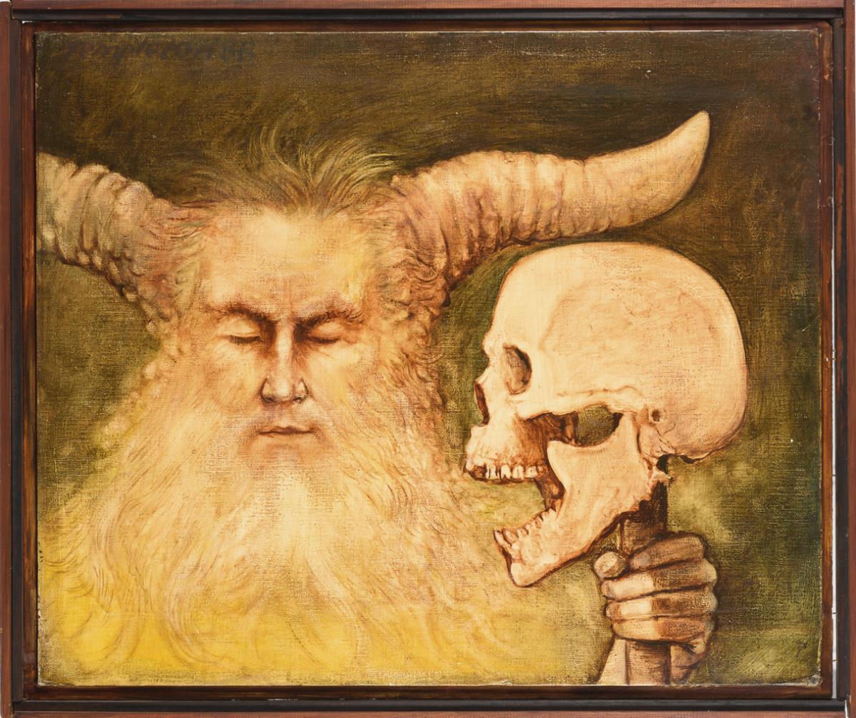 Frontales Bildnis eines älteren Mannes mit langem Bart und Hörnern mit einem Schädel auf einem Stab.