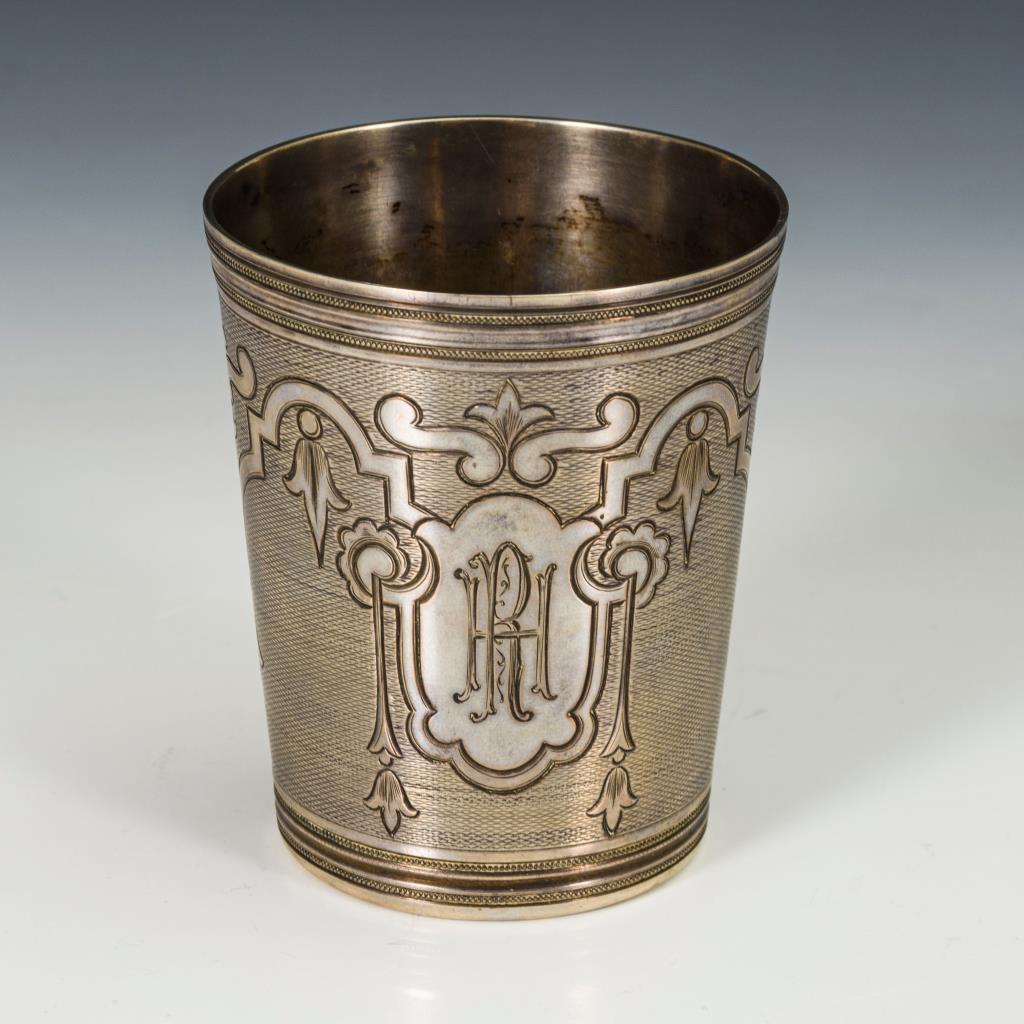 Guillochierter und floral gravierter Becher mit Monogramm "HR".