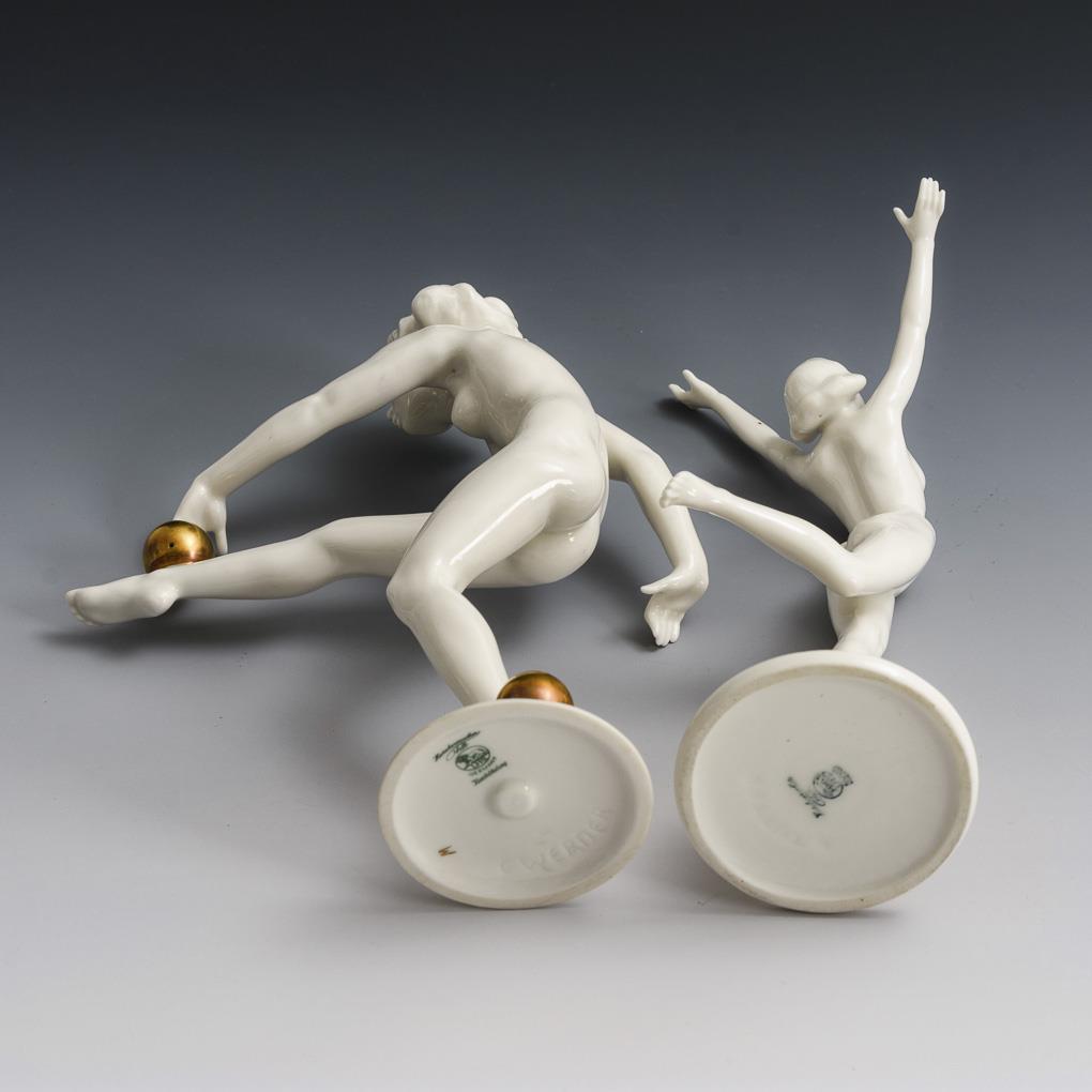 1x Tänzerin mit zwei Kugeln (Entwurf Carl Werner, bezeichnet). / 1x auf einer Kugel stehender Frauenakt.