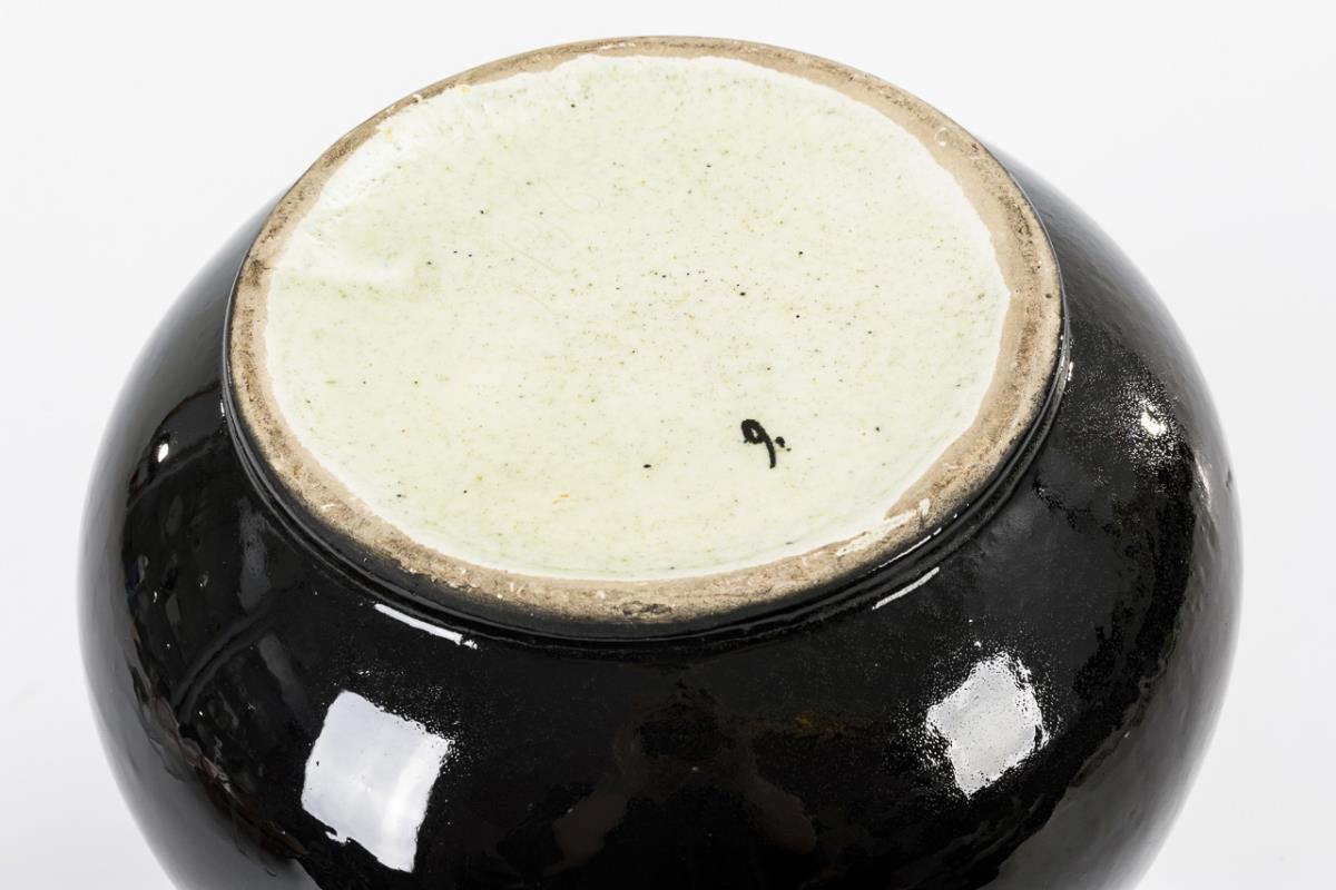 Steingut, schwarz glasiert, farbig staffiert. H 22 cm.