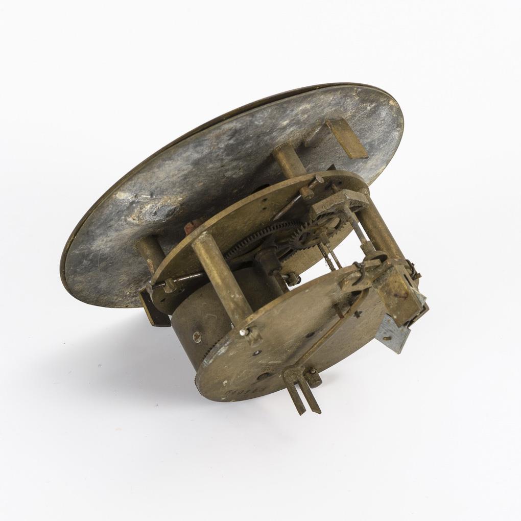 Gemarktes Gehwerk lose anbei, defekt. Messingzifferblatt mit geprägten, arabischen Zahlen, Zeiger fehlen.