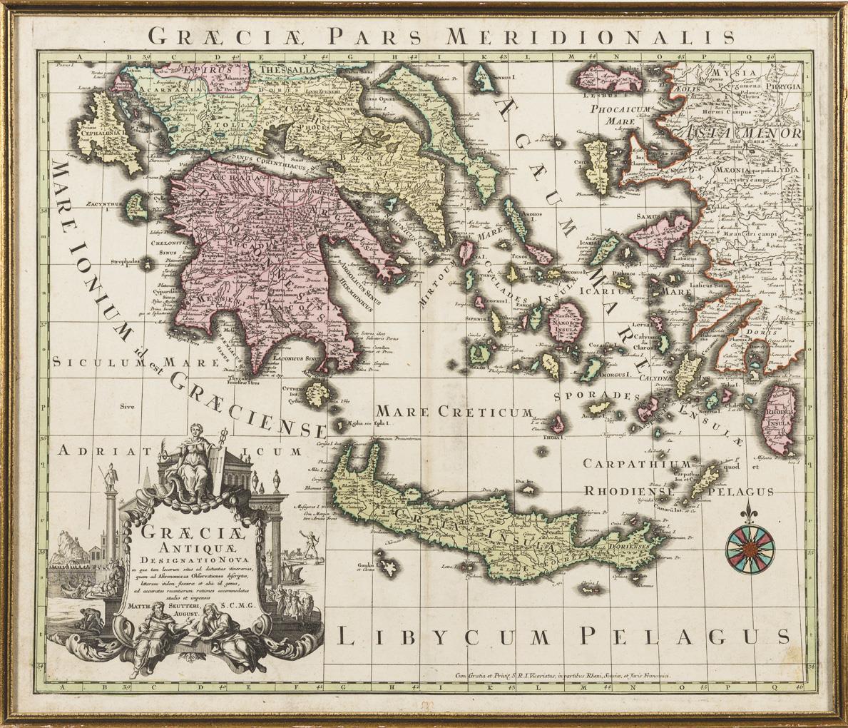 Detailreiche Karte des südlichen Teils von Griechenland, mit figurativer Titelkartusche "Graeciae Antiqvae Designatio Nova[...]", bezeichnet "Graecivae pars Meridionalis". Bugfalte, griffspurig, etwas stockfleckig.