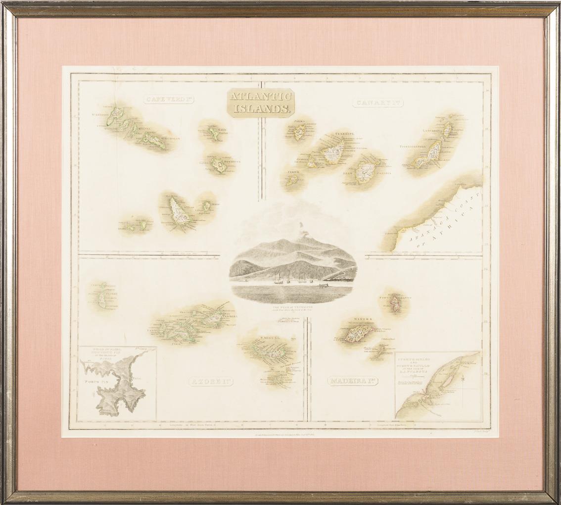 Detailreiche, 4-fach gegliederte Karte der Kanarischen Inseln "Cape Verd", "Canary", "Azore" und "Madeira", im Zentrum zentralperspektivischer Blick auf den Pico del Teide - Teneriffa, bezeichnet "Atlantic Islands", aus John Thomsons "New General Atlas", 1817. Etwas griffspurig.