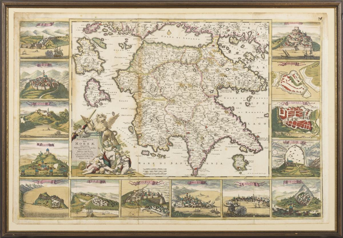Detailreiche Karte der Halbinsel, gerahmt von Ansichten zahlreicher Festungen, mit figürlicher Titelkartusche "Peloponnesus hodie Morae Regnum in omnes suas provincias veteres et hodiernas accurate divisum". Mehrfach gefaltet - Falten teils gerissen, griffspurig, stockfleckig.