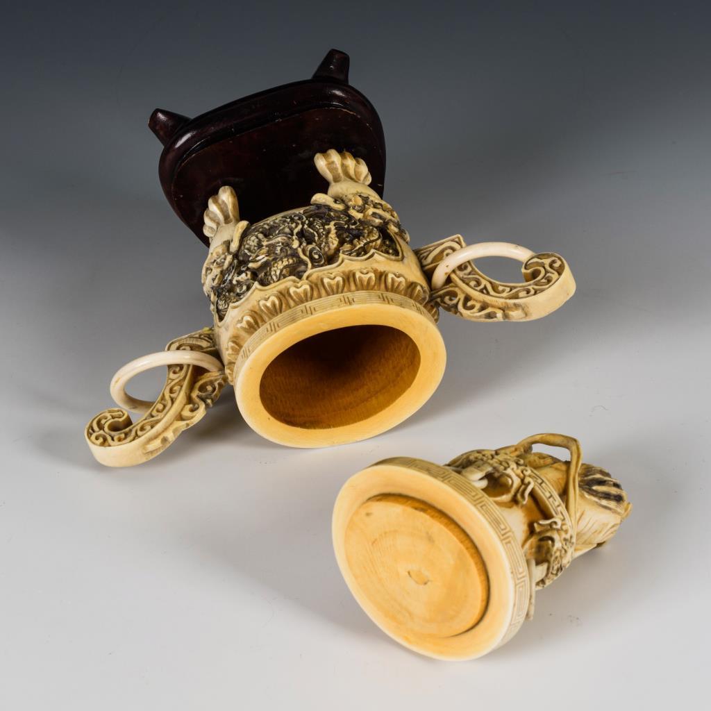 Henkelgefäß mit abnehmbarem Deckel und beweglichen Zierringen. Relief mit Drachenschnitzerei. Auf Holzsockel befestigt.
