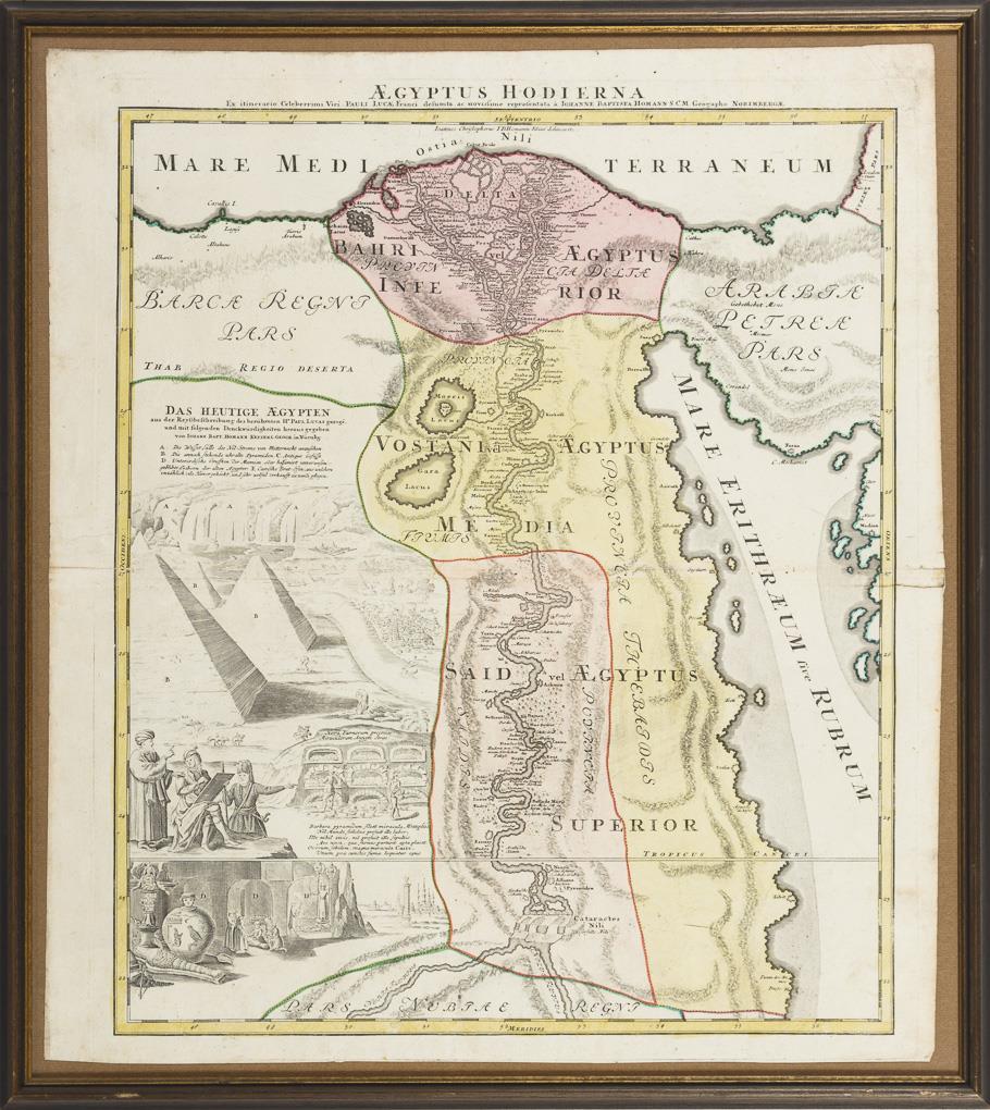 Karte des Nillaufes von den Katarakten des Mittellaufes bis zur Mündung, Titelkartusche "Ägyptus Hodierna - Das heutige Ägypten aus der Reyßbeschreibung des berühmten Hr. Paul Lucas gezogen und mit folgenden Denckwürdigkeiten herausgegeben [...]", im linken Bereich mit figurativen Ansichten der Nil-Wasserfälle, Pyramiden, antiken Gefäßen, Gruften von Mumien und unverwesten Körpern und Brut-Öfen. Bugfalte, etwas griffspurig, Riss am linken Rand.