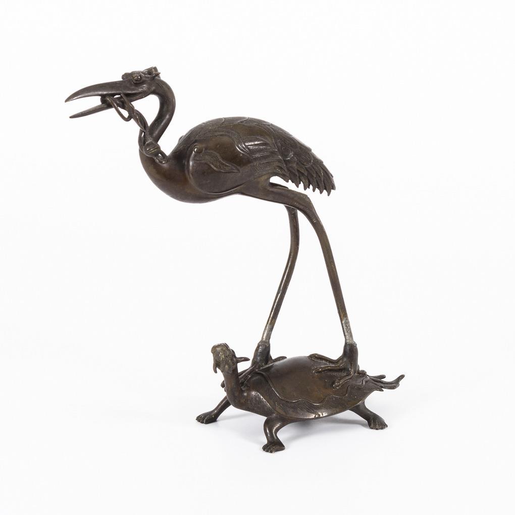 Vogel mit Lotosstengel im Schnabel auf Minogame. Feine Ausführung des Glückssymbols. Einsatz für Kerzenhalter o.ä. fehlt, Beine wohl angelötet.