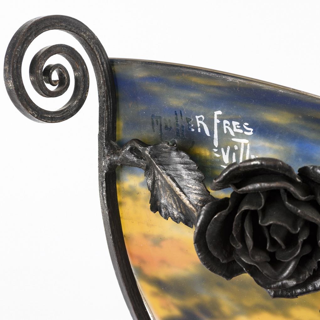 Glashalbschale, montiert in einen Eisenrahmen mit Rosenranke.