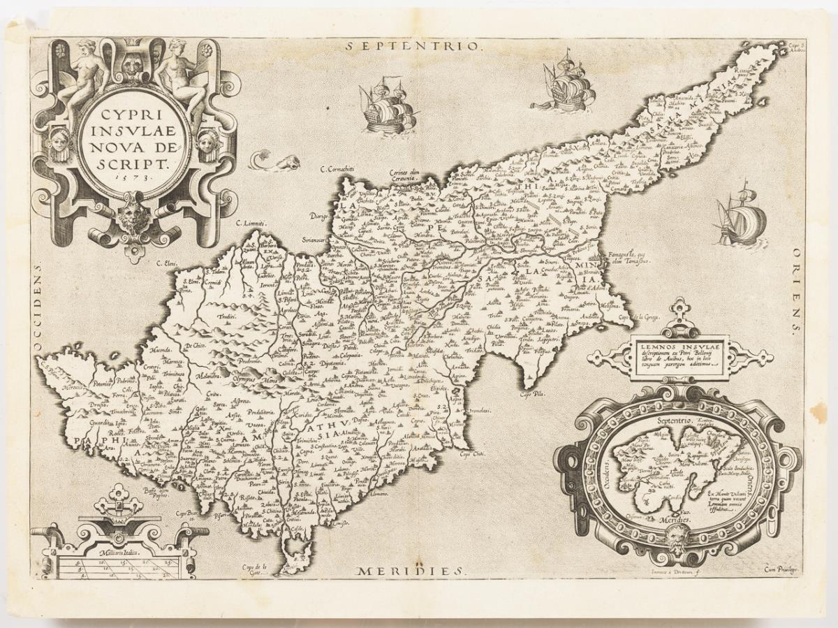 Frühe Landkarte der Insel Zypern im Mittelmeer, dekoriert mit Schiffen und einem Seeungeheuer, in einer Rollwerkkartusche eine kleine Karte der Insel Lemnos, mit Rollwerk gerahmte Titelkartusche: "Cypri Insulae Nova Descript. 1573"; aus der niederländischen Ausgabe von Abraham Ortelius' Atlas "Theatrum Orbis Terrarum", verso mit Textteil in niederländischer Sprache. Bugfalte, Ecke oben links defekt, im Randbereich mit Wasserschaden, teils beschnitten.