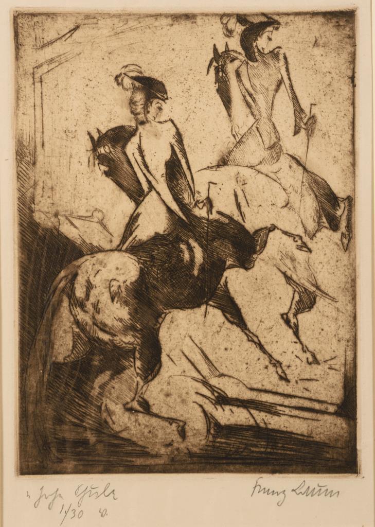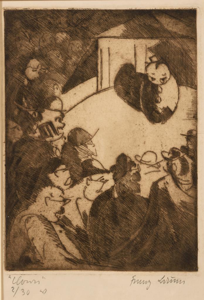 2 abstrahierte Werke mit Zirkusdarstellungen: Clown in der Manege und 2 Reiterinnen. Minimal fleckig.