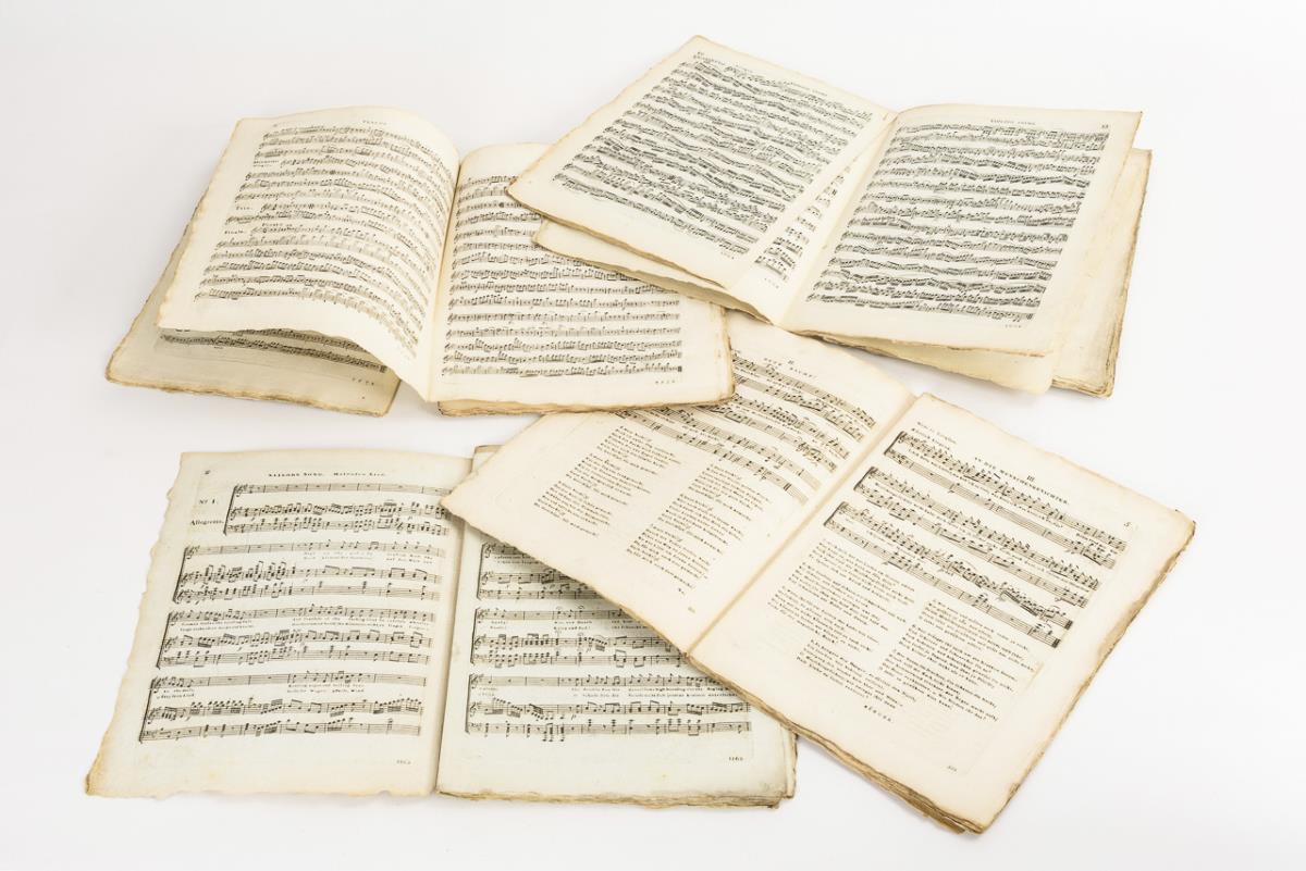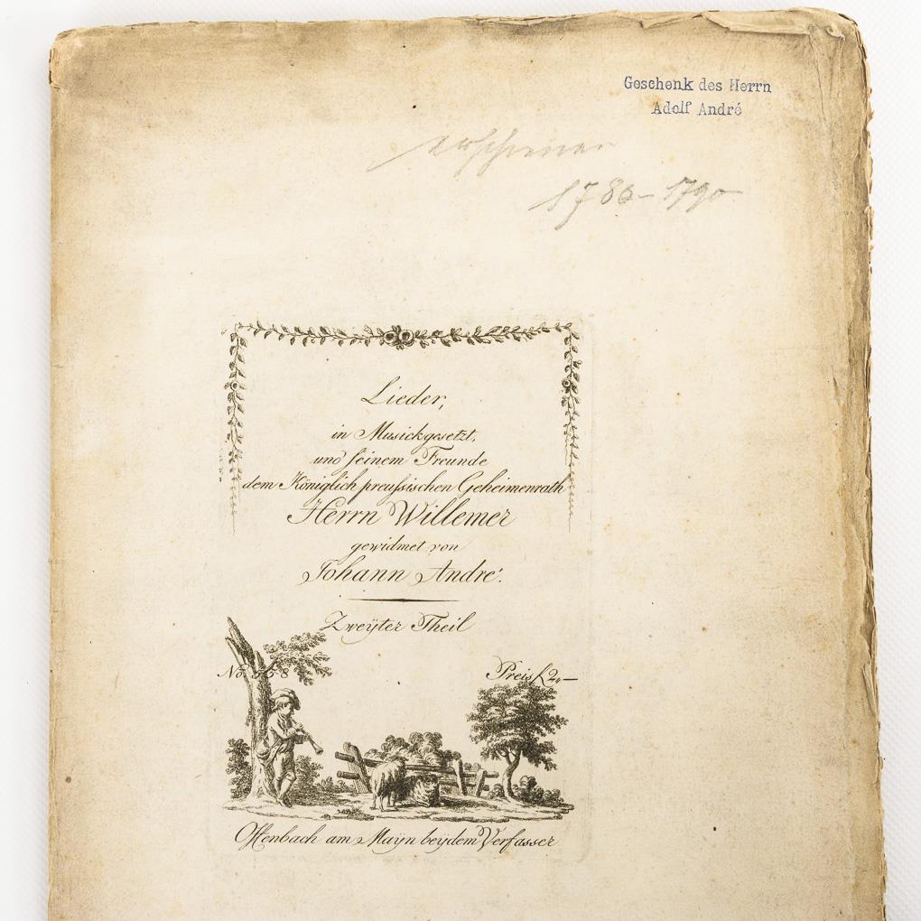 Haydn: "Sonfonie à Grand Orchestre", Oevre 80me, seconde edition. Nr. 2577.2578, 48 Seiten. / Krommel: "Trois Quatuors nouveaux pour deux Violons, Alto et Basse", Nr. 1608, Oeuvre 20me. 62 Seiten. / "Lieder in Musik gesetzt und seinem Freunde dem Königlich preußischen Geheimenrath Herrn Willemer gewidmet von Johann André". Nr. 558. 2. Teil. 28 Seiten. / "Haydn: "Sechs englische Lieder mit unterlegten deutschem Texte" 87stes Werk, Nr. 1163. 20 Seiten. Ungebundene und unbeschnittene Bögen. Guter, leicht verschmutzer Zustand.