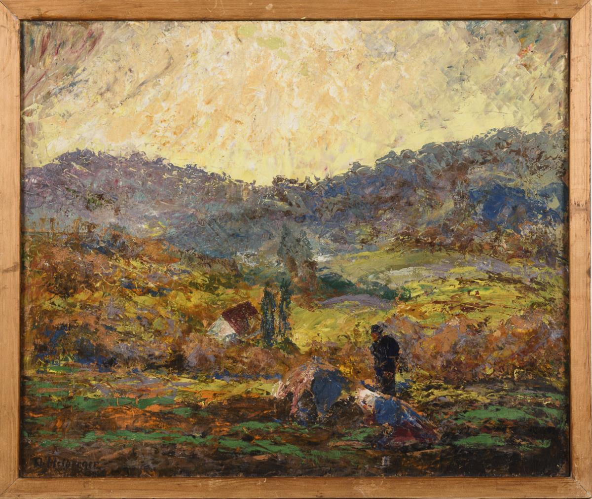 Die Bauern auf dem Feld mit Blick hinab zum Haus.